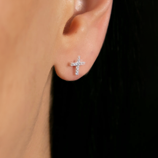Stud Earrings Rhodium Plated Silver Cross with CZ