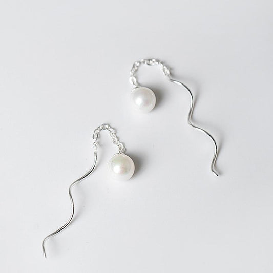 Pearl Dangle Earrings Wave Thread Tassel with Silver Chain