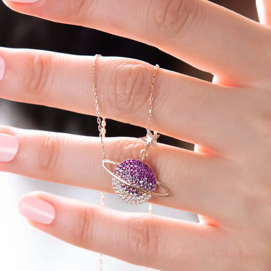 Saturn Planet Chain Necklace Black Cubic Zirconia in 925 Silver