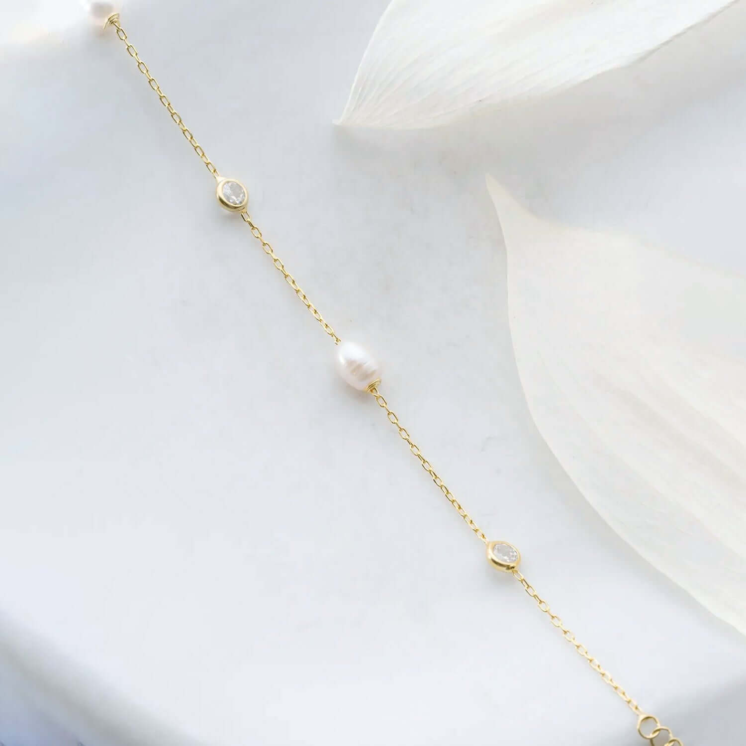 Be the envy of your friends with this garcefully feminine bracelet, featuring luminous natural pearls and glimmering cubic zirconia crystals linked together with a delicate chain!