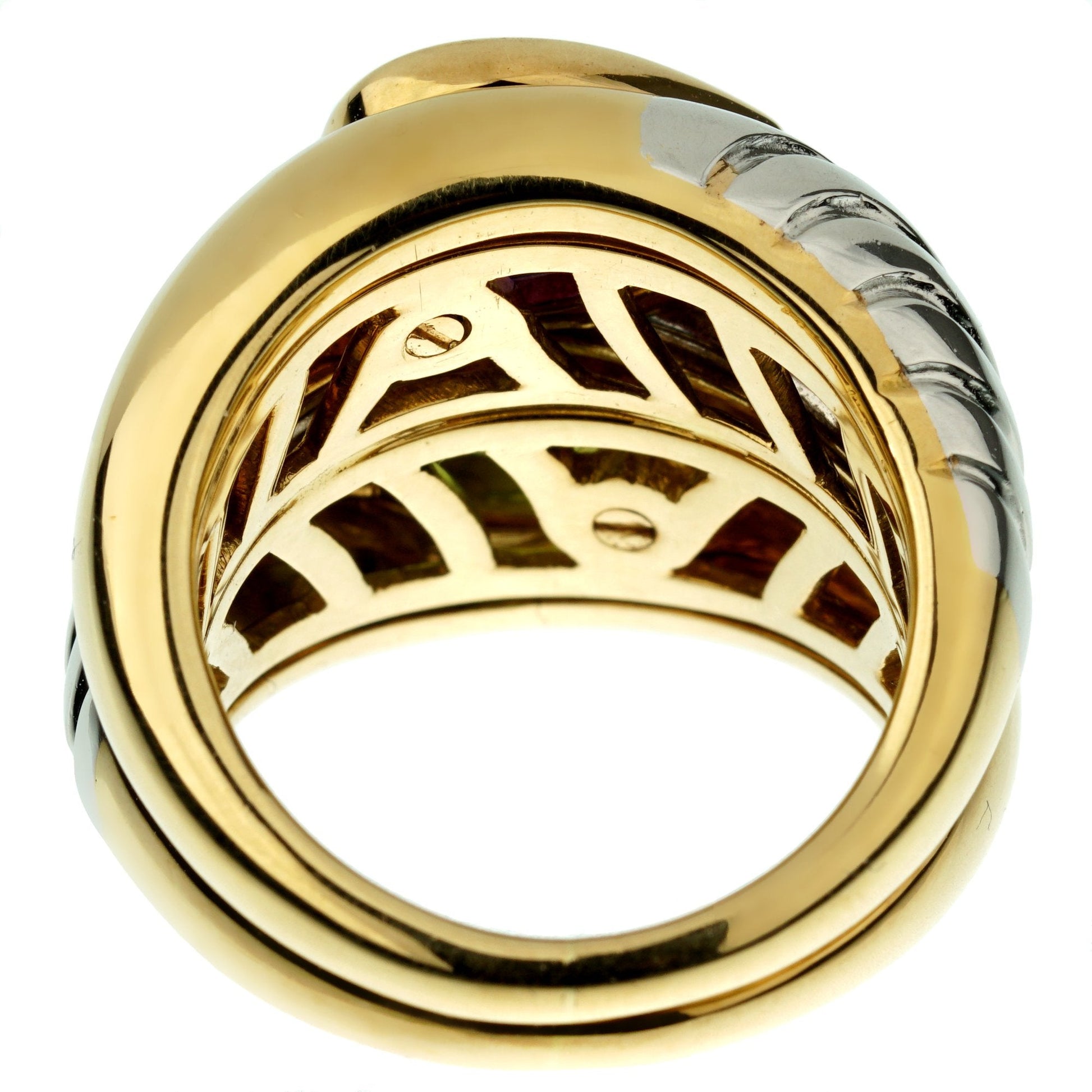The lustrous white gold setting enhances the brilliance of the amethyst and peridot, while the warmth of the yellow gold band adds a touch of elegance and luxury. This remarkable blend of colors and materials creates a statement piece that is sure to catch the eye and leave a lasting impression.