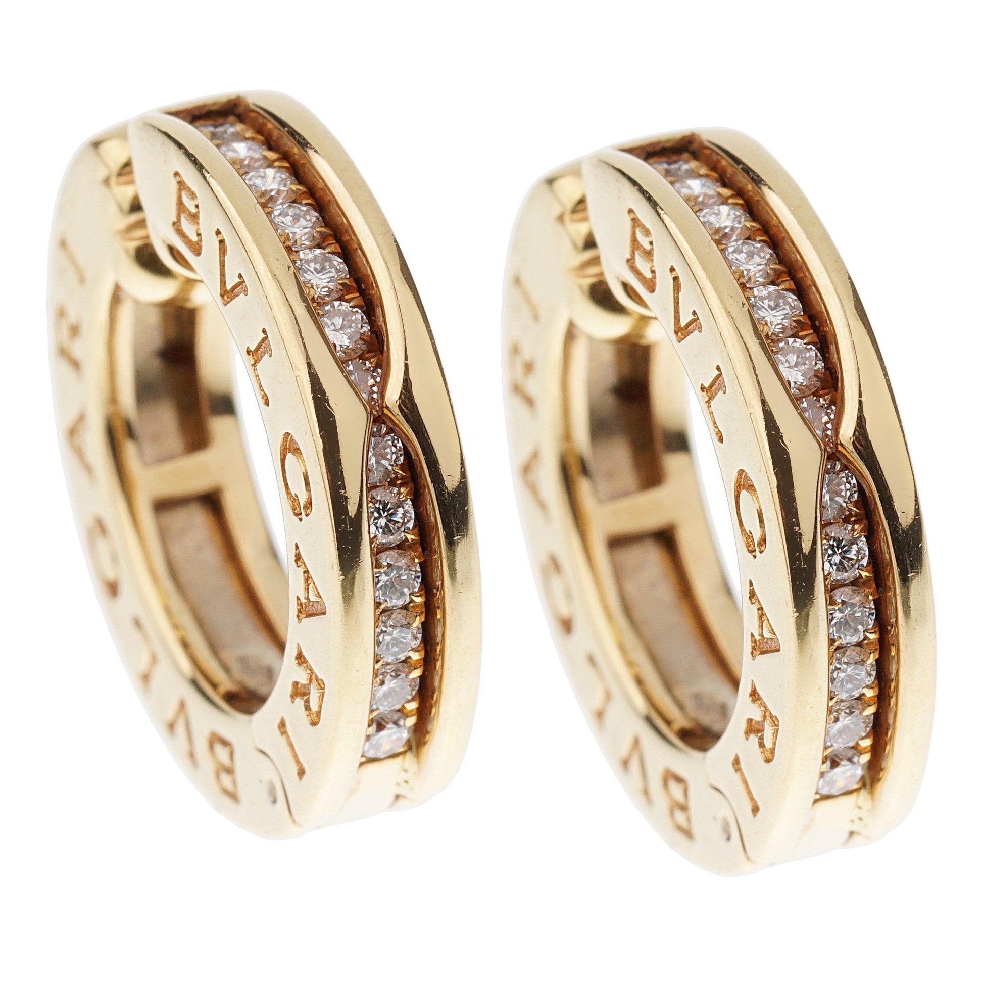 A chic set of Bvlthtgari Bzero1 earrings showcasing a row of 26 round brilliant cut diamonds VS clarity F-G Color set in 18 yellow gold. The earrings have a diameter of .74' and a weight of 14.8 grams