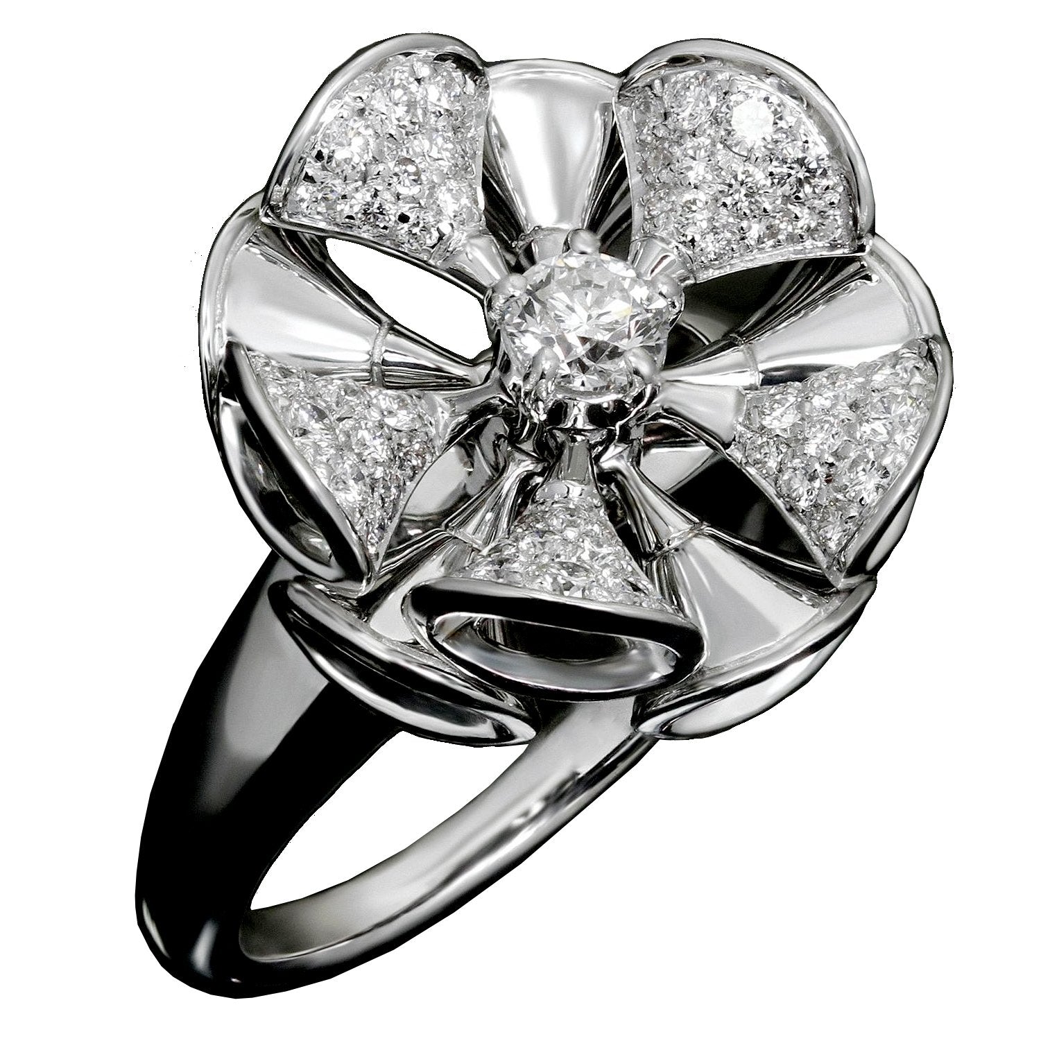 The Bvlthtgari Divas Dream diamond cocktail ring is the epitome of feminine elegance. The ring is designed after the Baths of Caracalla's marble and the curves of fan shaped motifs, and is crafted from 18k white gold. It has a total weight of 1.05ct, with a central diamond measuring .20ct. This ring is sure to make any woman feel like a diva!