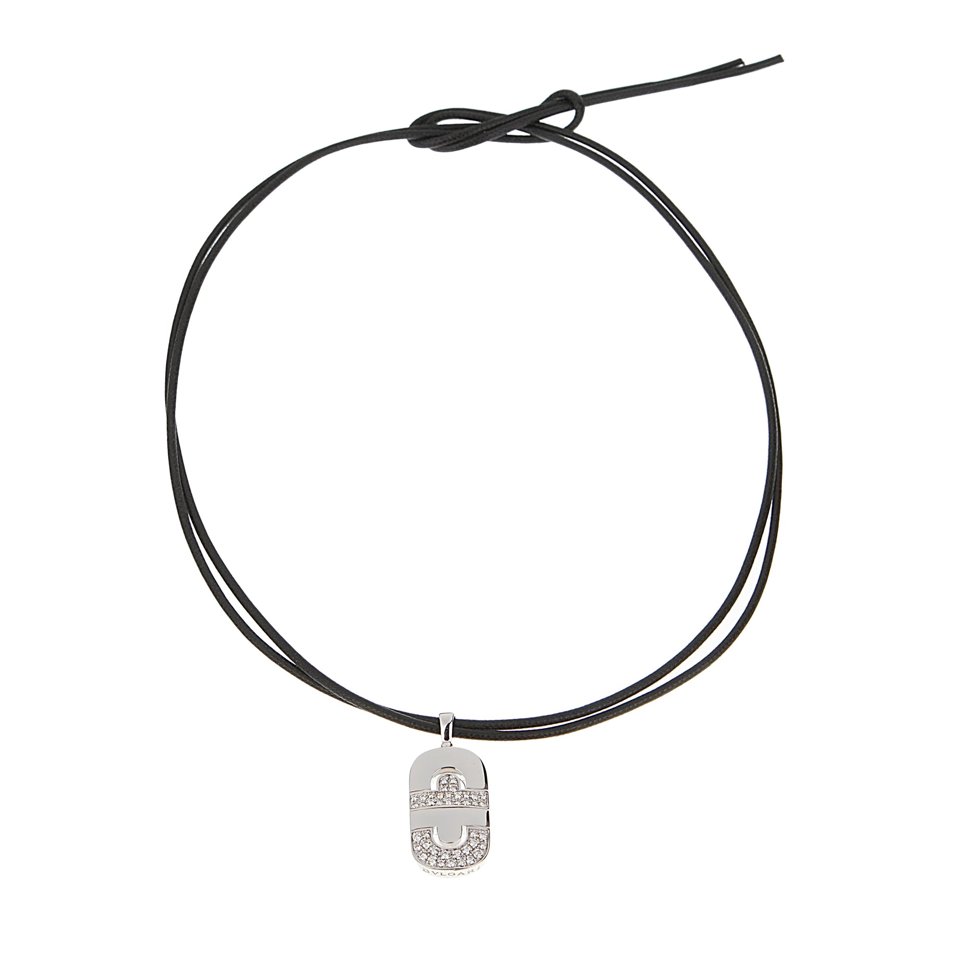 Bvlthtgari?¡¥s dedication to excellence is evident in every detail of this necklace. The 18k white gold is meticulously polished to achieve a mirror-like finish, enhancing the pendant?¡¥s sleek and sophisticated appearance. The diamonds, carefully selected for their clarity and brilliance, are expertly set to maximize their sparkle. The durable and stylish black cord complements the pendant, ensuring a comfortable and secure fit while adding a contemporary touch.