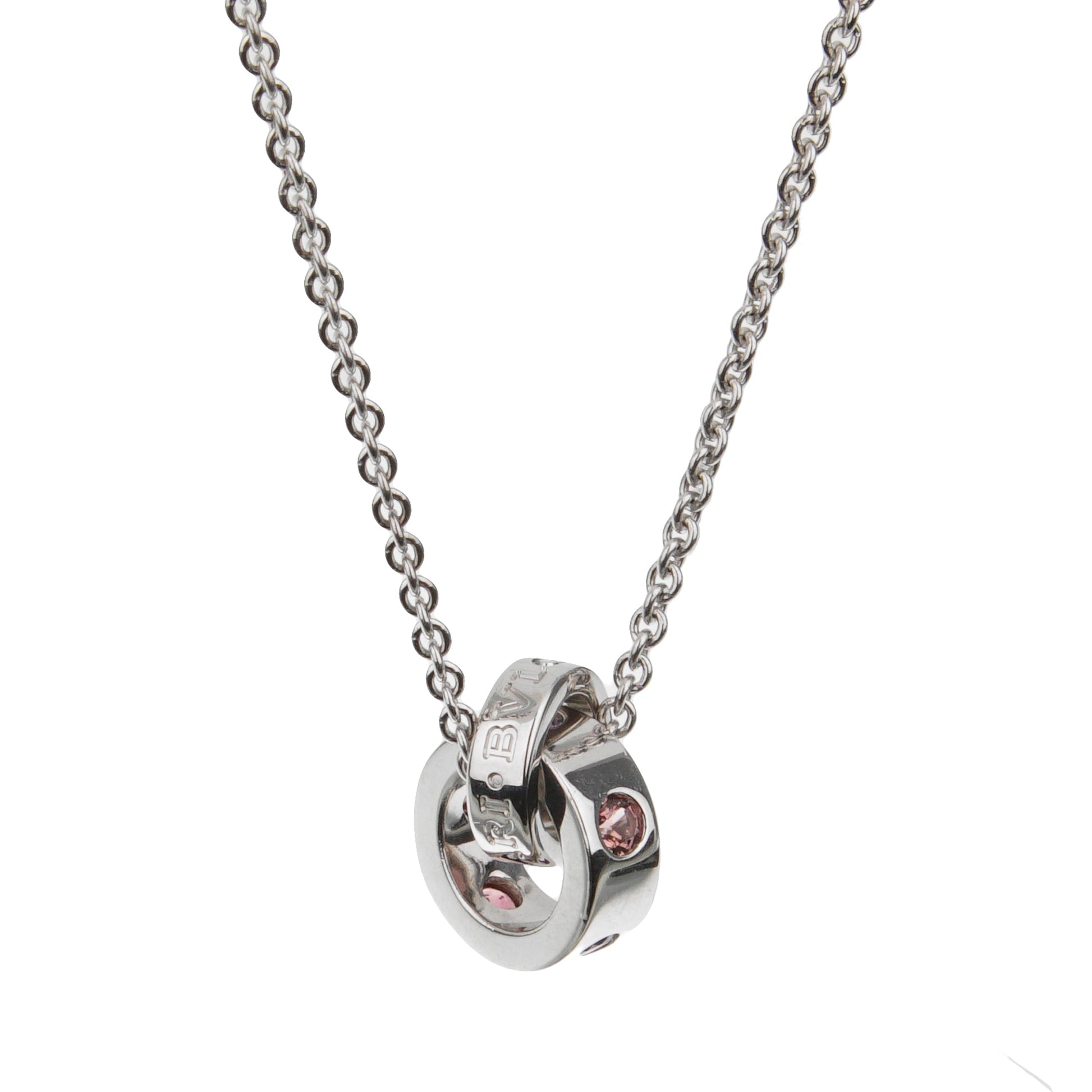 The pendant consists of two interlocking rings, each meticulously crafted to create a harmonious and balanced look. The rings are designed with clean, smooth lines, adding a touch of sophistication to the overall design. One of the rings is engraved with the iconic Bvlthtgari logo, signifying authenticity and luxury.