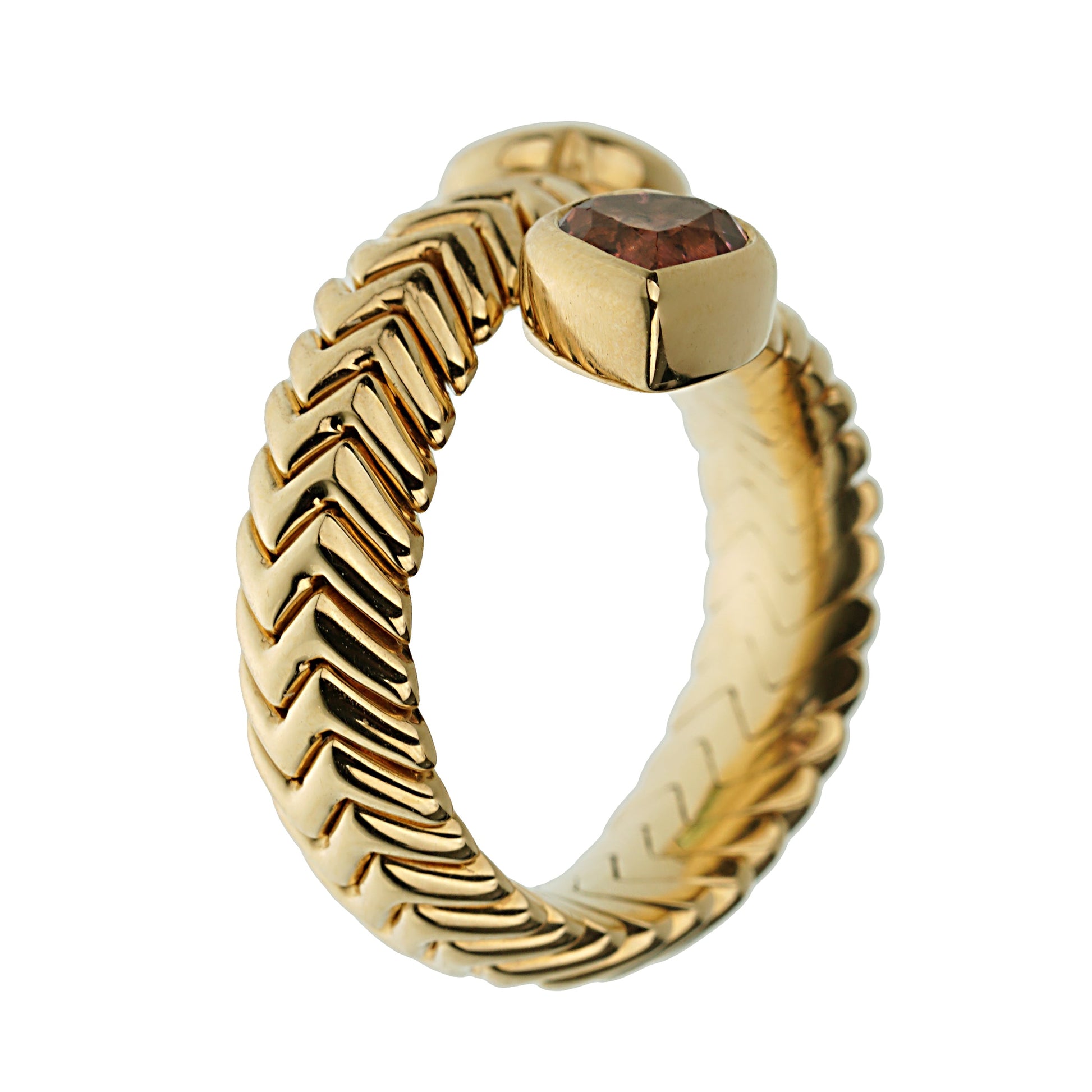 The Spiga pattern is meticulously crafted, with each segment of the gold forming a distinctive zigzag pattern that wraps seamlessly around the finger. This textured design not only adds visual interest but also enhances the ring's tactile appeal, making it comfortable and engaging to wear.