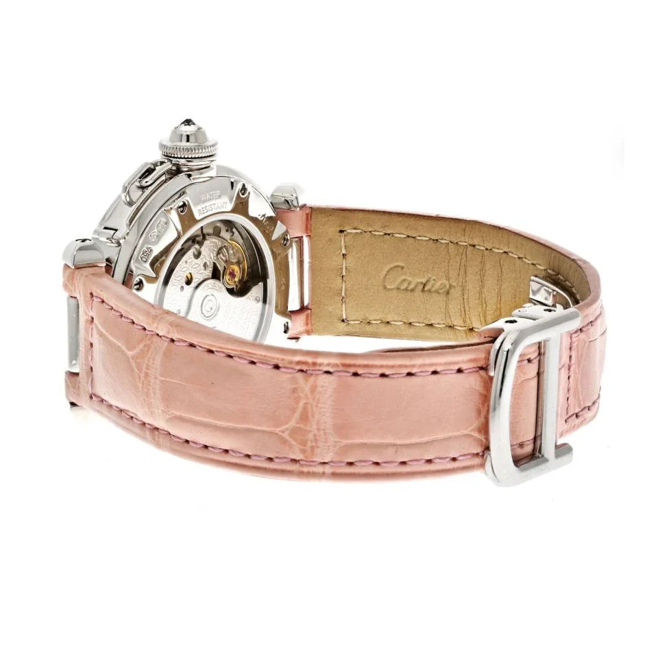 The Carthttier 18K White Gold 32mm Pasha Factory Diamond Bezel 2528 ladies watch on a pink leather strap is a luxurious timepiece that embodies the sophisticated and timeless style of the Carthttier brand. This watch features an 18K white gold case with a diamond-encrusted bezel, adding a touch of glamour and elegance to the overall design. The pink leather strap provides a playful and feminine touch to the watch, making it a perfect accessory for any occasion. The 32mm case size is ideal for women who prefer a smaller and more delicate watch. The Pasha 2528 model is a rare and coveted watch that is sure to impress any collector or Carthttier enthusiast.