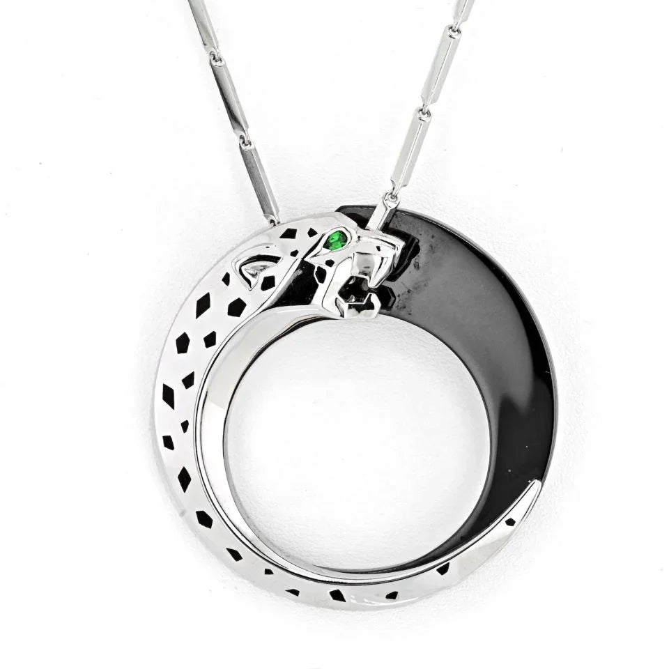 Important Carthttier 18k White Gold Tsavorite Garnet, Onyx, Black Lacquer Spots, Ceramic Panther de Carthttier Necklace. From the Panth¨¨re De Carthttier Collection. Instantly recognizable Carthttier, given that the Panther is possibly the most famous and admired design of the Carthttier collections.