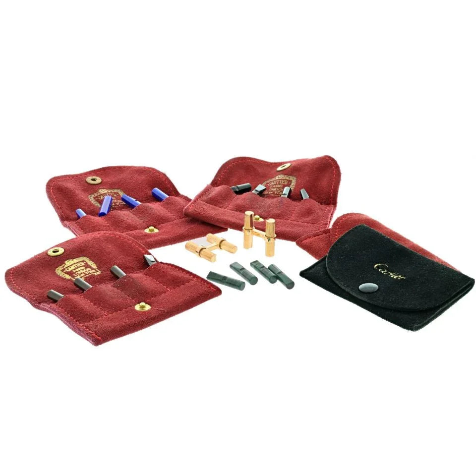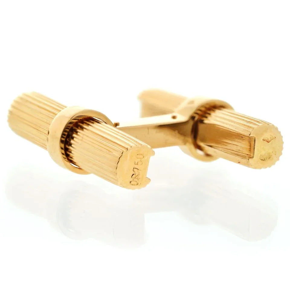 Exemplifying both elegance and versatility, these Carthttier cufflinks are a masterpiece of design. Crafted in 18k yellow gold and hailing from the 1960s, they showcase a unique baton design that's perfect for daily wear. What truly sets these cufflinks apart are the changeable stone bars, which can be customized to suit your mood or outfit. The options include Lapis Lazuli, Malachite, and Black Onyx, allowing you to effortlessly adapt your style. Carthttier's timeless craftsmanship and the timeless appeal of these cufflinks make them a must-have addition to any gentleman's collection.