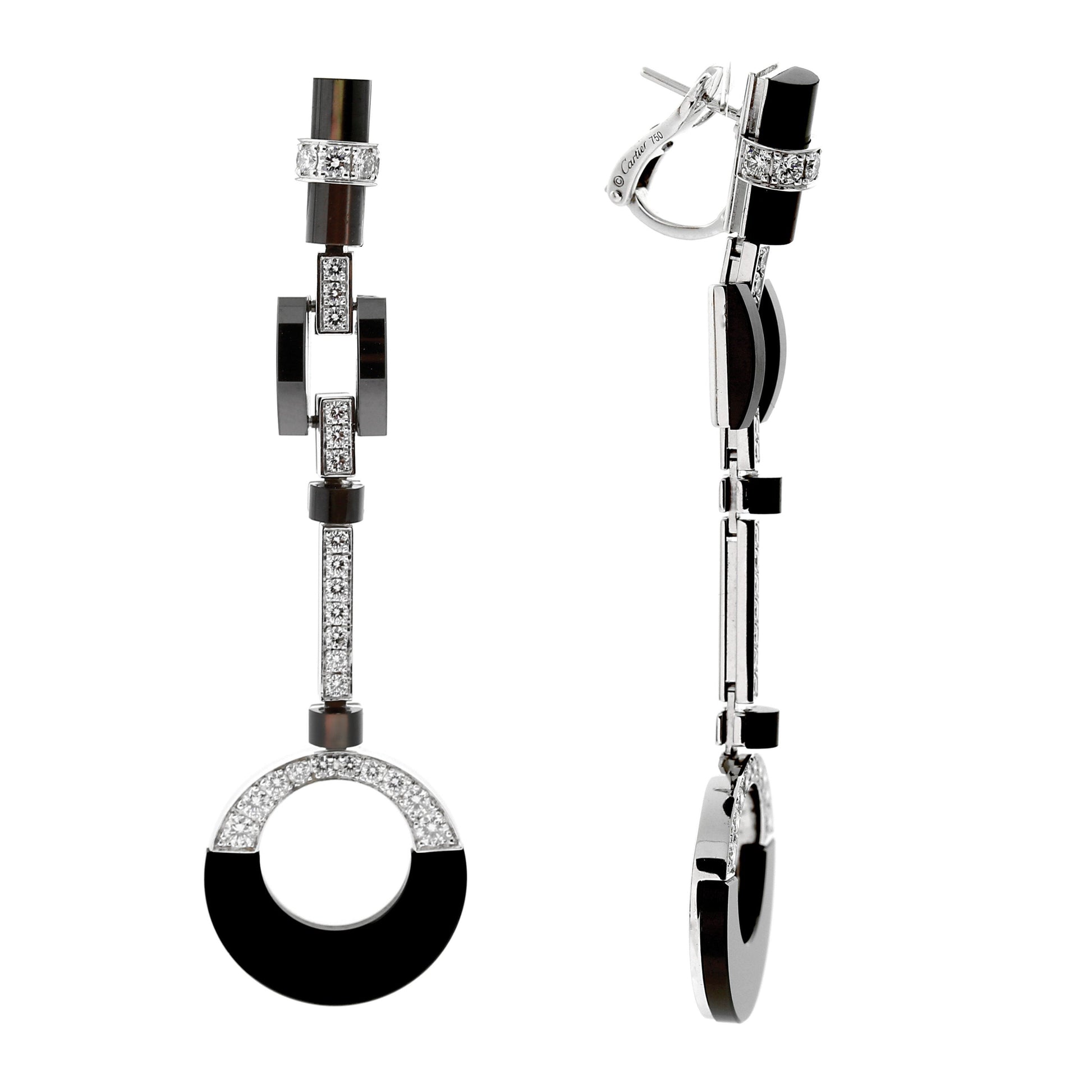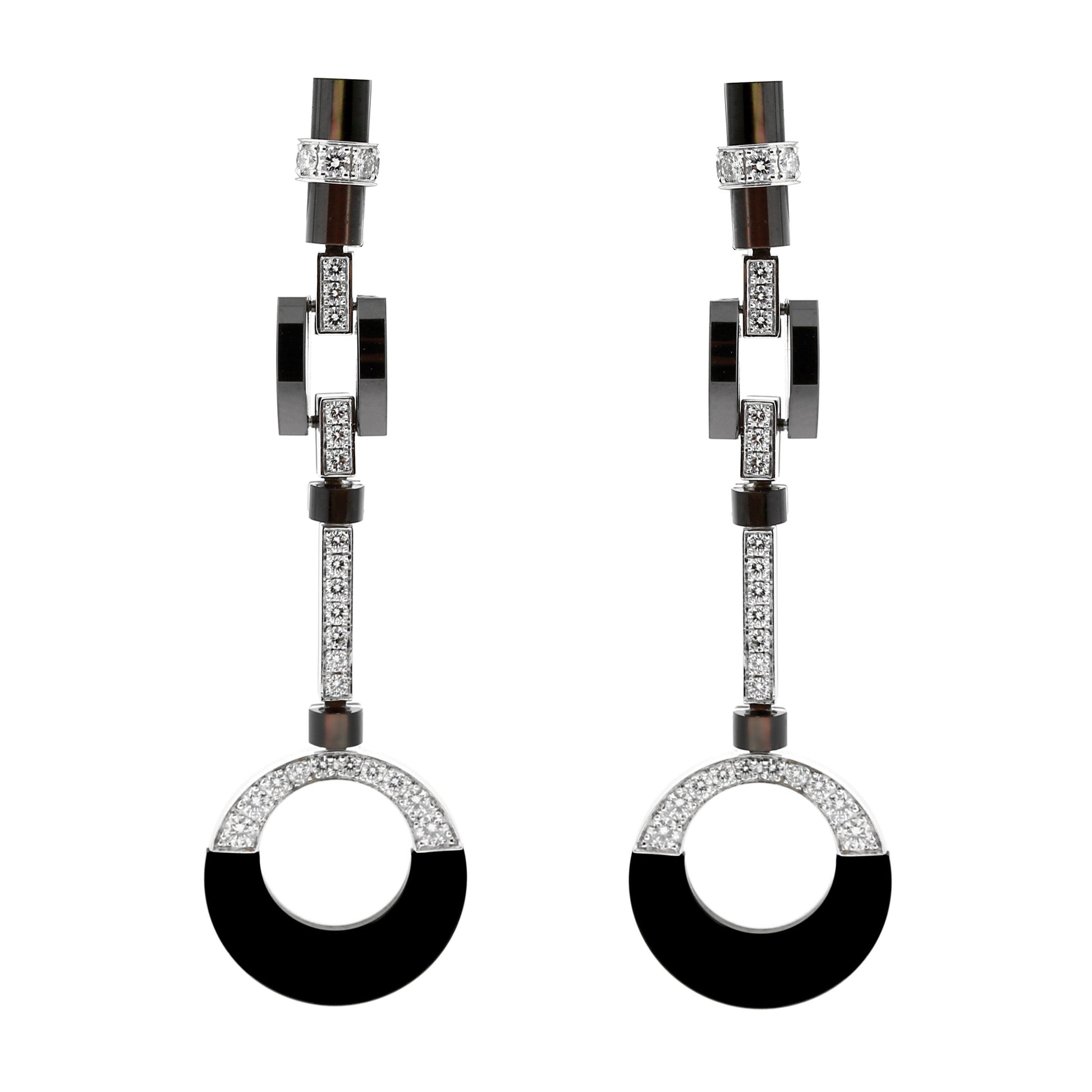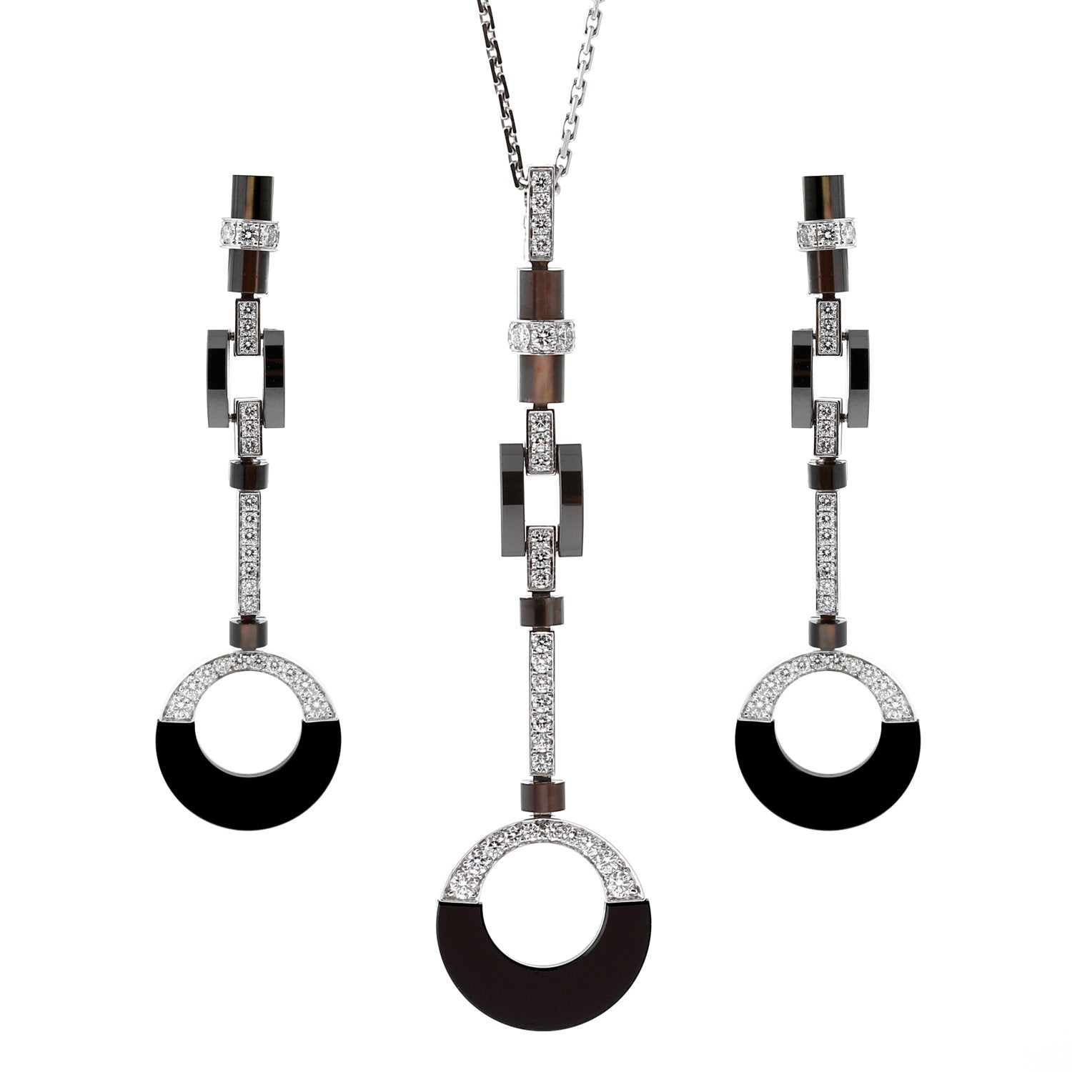 Diamonds, Mother of Pearl, White Gold; Carthttier Midnight Elegance for all occasions. A fabulous Carthttier Suite featuring a sparkling and engaging ceramic drop necklace and matching geometric earrings that boast brilliant cut diamonds in 18k white gold, accented with artistic ceramic touches and black mother of pearl. For the fearless, for the unique, only Carthttier.