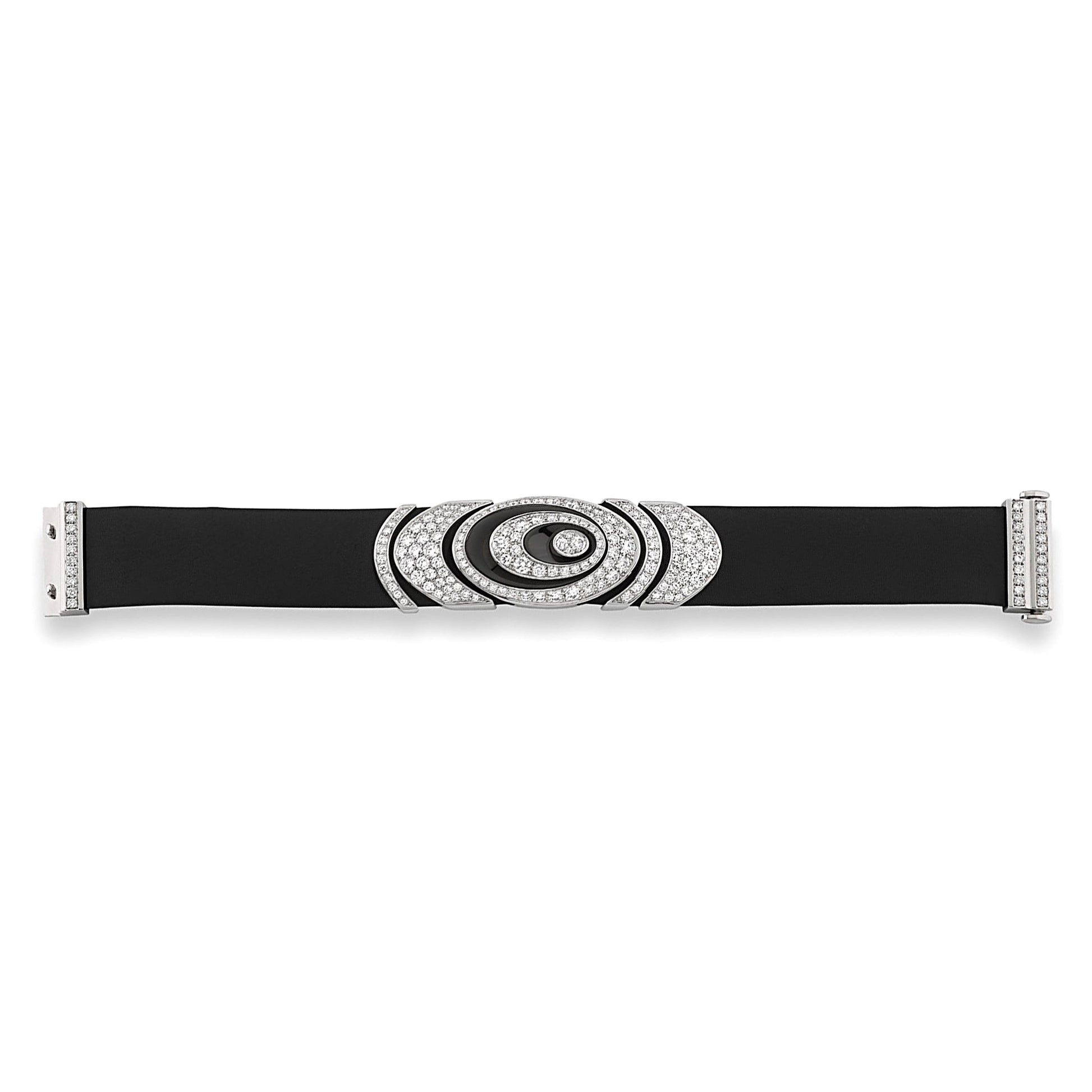 At the heart of this stunning bracelet are the carefully selected, brilliant-cut diamonds. Each diamond is a masterpiece of cutting and clarity, arranged in a harmonious pattern that catches the light at every angle, producing a captivating sparkle that is the hallmark of Carthttier jewels.?Accenting the brilliance of the diamonds is the deep, rich enamel that complements the white gold with a touch of mystery. The enamel work demonstrates Carthttier's meticulous attention to detail and the high standards of its artisans. The combination of enamel and diamond creates a striking contrast that is both bold and classic, embodying the essence of timeless style.