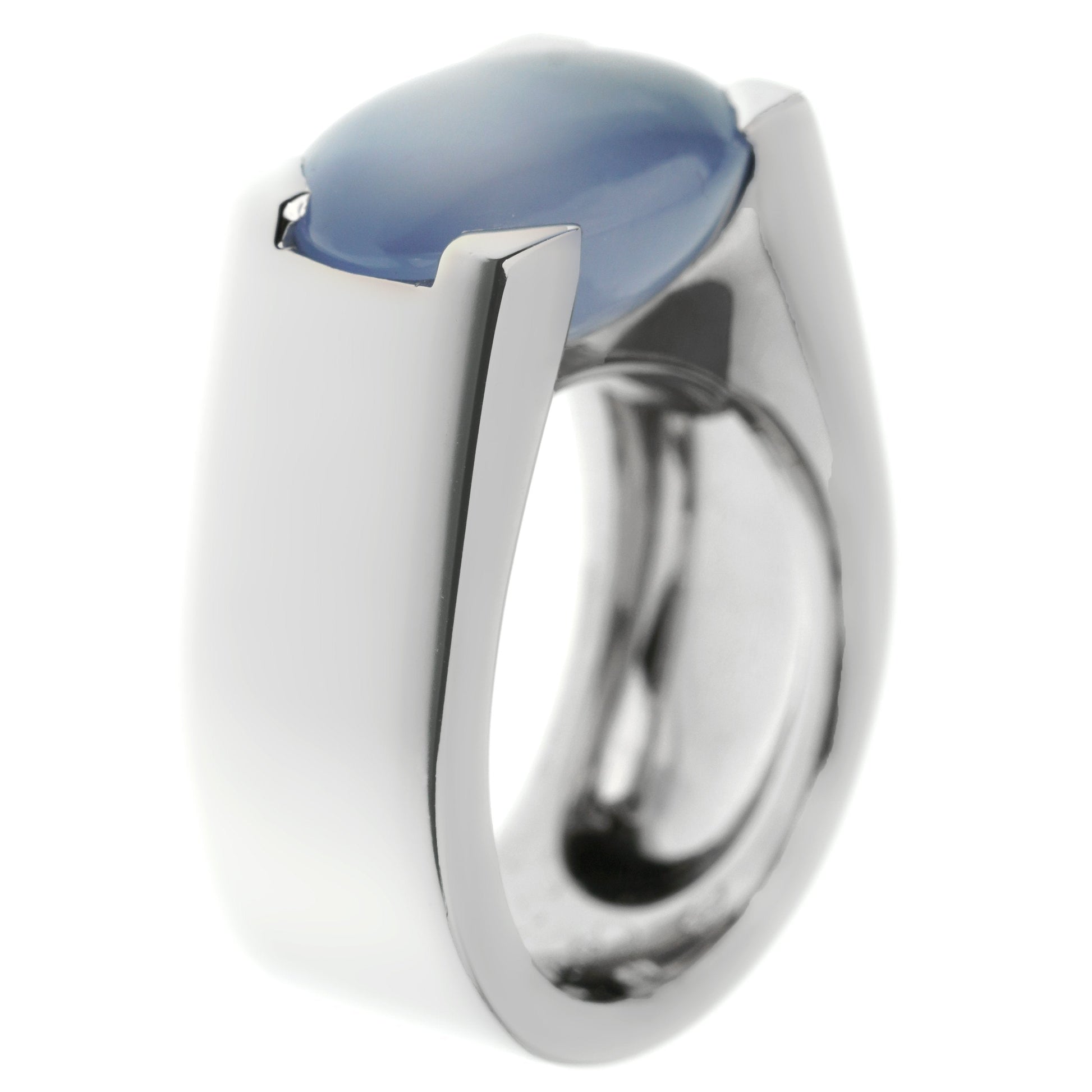 The chalcedony, measuring an impressive 14x5 mm, is the star of this piece. Known for its subtle, waxy luster and translucency, chalcedony is a gemstone that exudes serene elegance. This gemstone's calming blue hue contributes to the ring's overall allure, presenting a stark yet harmonious contrast against the cool sheen of the white gold setting. The chalcedony is cut and set with meticulous precision, reflecting Carthttier's commitment to perfection in every detail.
