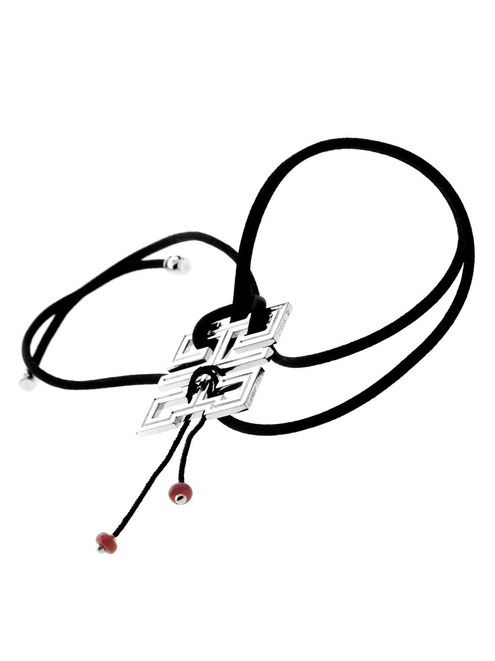 The Carthttier Le Baiser Du Dragon Necklace is made from 18-karat white gold, featuring an intricate geometric design. Two ruby beads dangle from the pendant to enhance the piece. In forming the necklace pendant, Carthttier's artisans included raised sections that add interest to the accessory.