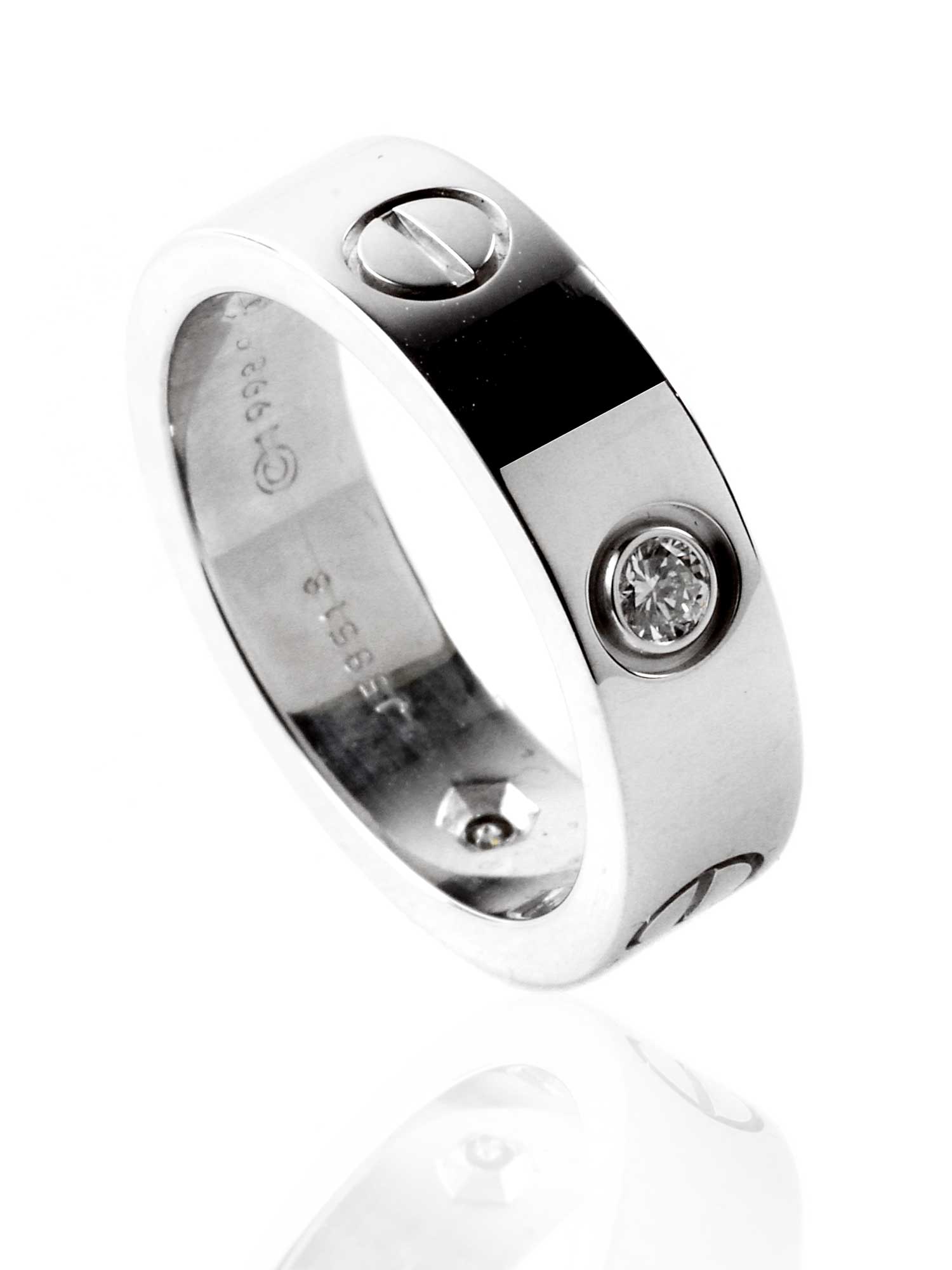 Carthttier's coveted Love collection receives a spectacular new addition with this 18k white gold ring. Boasting the familiar Love collection screw-style imprints along with gorgeous, glittering diamonds, this piece sets an imposing new standard for style and sophistication among top tier rings.