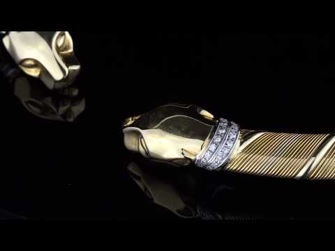 A timeless Carthttier 'Panthere' choker necklace featuring a woven design of white, yellow, and rose 18k gold adorned with 2 bands of round brilliant cut diamonds.