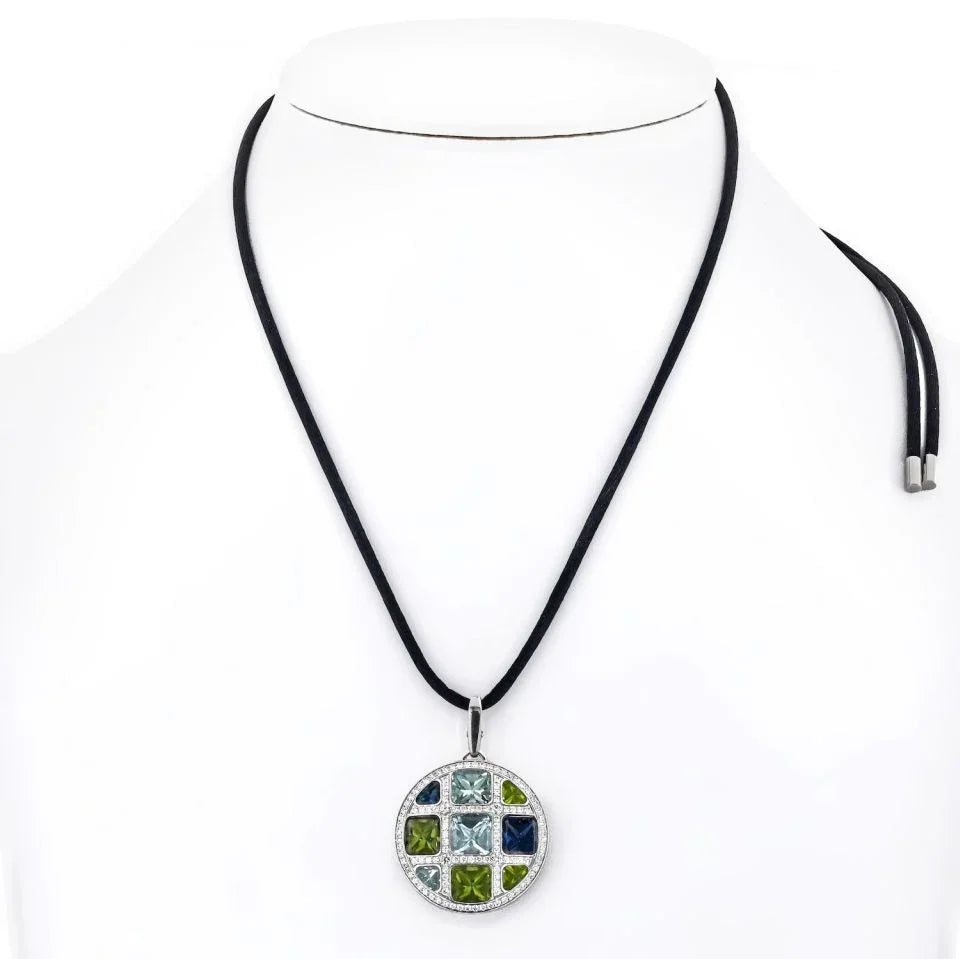 The Carthttier Pasha de Carthttier Multi Gemstone 18k White Gold Pendant Necklace is a breathtaking piece of jewelry that exudes elegance and luxury. The pendant features a round shape with a unique grid layout that is set with dazzling round diamonds, aquamarine, beryl, peridot, tourmaline and iolite. The use of these vibrant gemstones adds a pop of color to the design, making it a perfect statement piece to elevate any outfit.