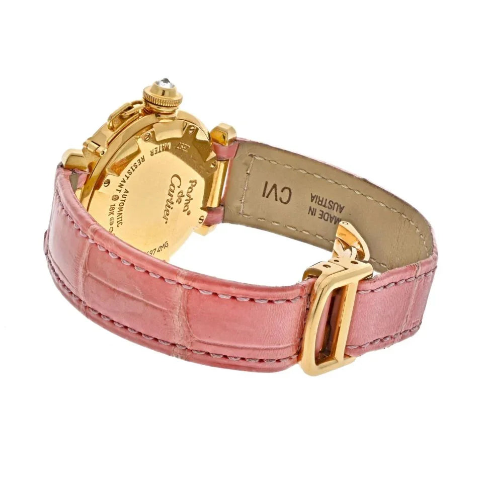 This magnificent Pasha de Carthttier ladies watch is crafted of solid 18k yellow gold and features an automatic movement. Very fine midsize center-seconds, self-winding, water-resistant to 100 m wristwatch for ladies.