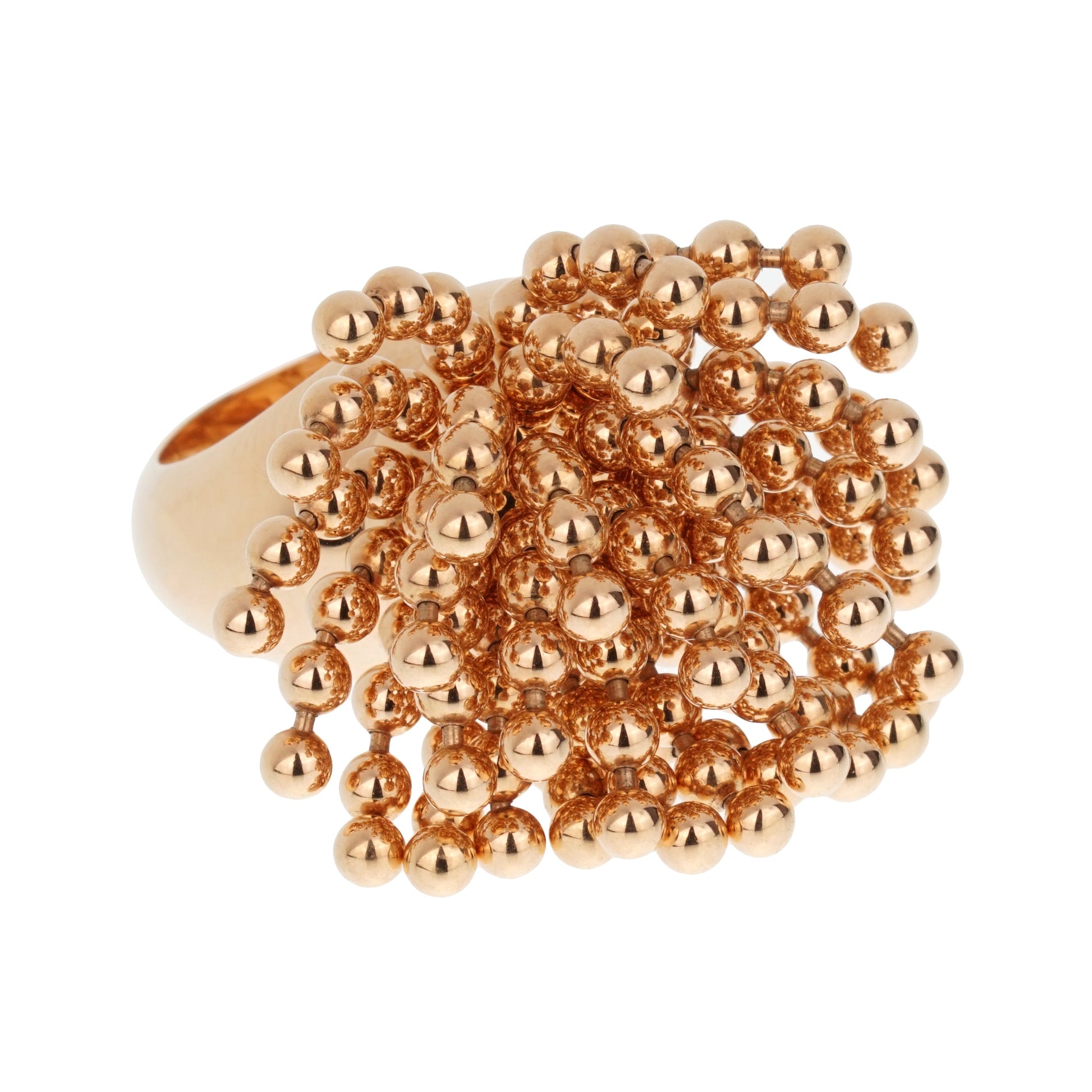 At first glance, the Perruque ring captivates with its distinctive 'wig' design, a playful nod to the voluminous hairstyles of bygone eras. The crown of the ring is adorned with a stunning cluster of meticulously polished rose gold spheres, arranged in an intricate, cascading formation that resembles a dynamic explosion of energy and movement. These spheres catch and reflect light from every angle, creating a dazzling, shimmering effect that draws attention and admiration.