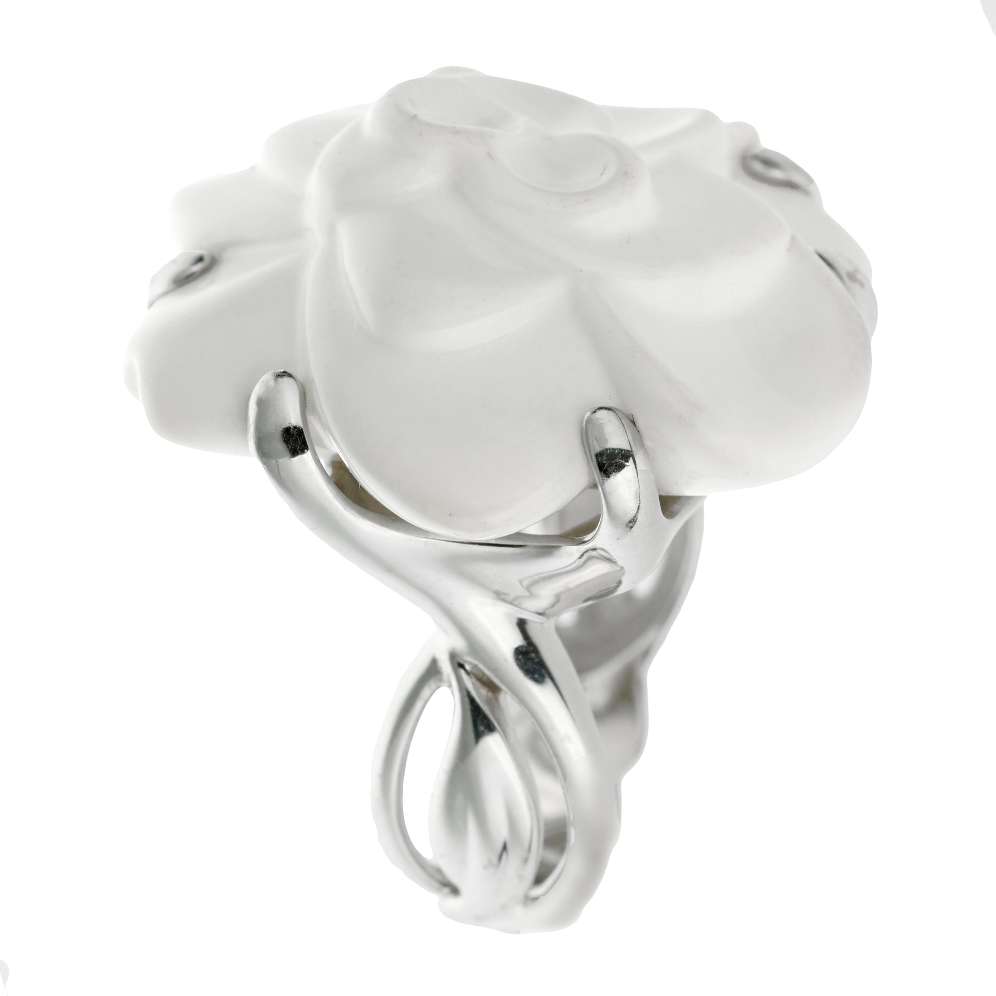 As a cocktail ring, this piece is bold and eye-catching, perfect for special events or as a statement accessory in a sophisticated ensemble. The combination of the serene white agate with the lustrous white gold and the classic elegance of the camellia motif makes this ring a unique and captivating piece. It reflects Chathtnel's commitment to creating timeless luxury items that are both stylish and impeccably crafted.