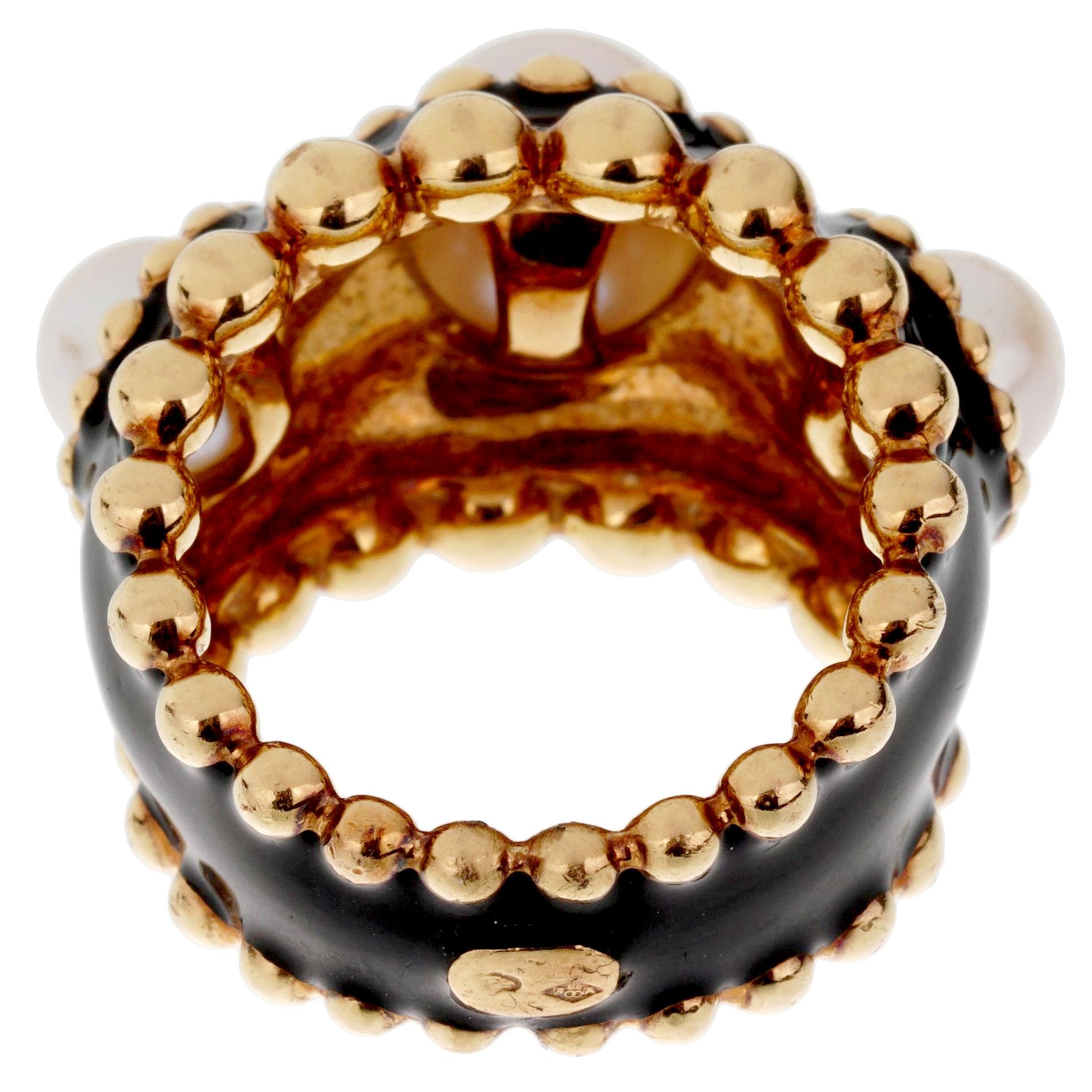 Adding a striking contrast to the design is a vibrant enamel inlay that forms the backdrop of the ring. This vivid hue beautifully offsets the creaminess of the pearls, amplifying their luster and creating a piece that is truly eye-catching.