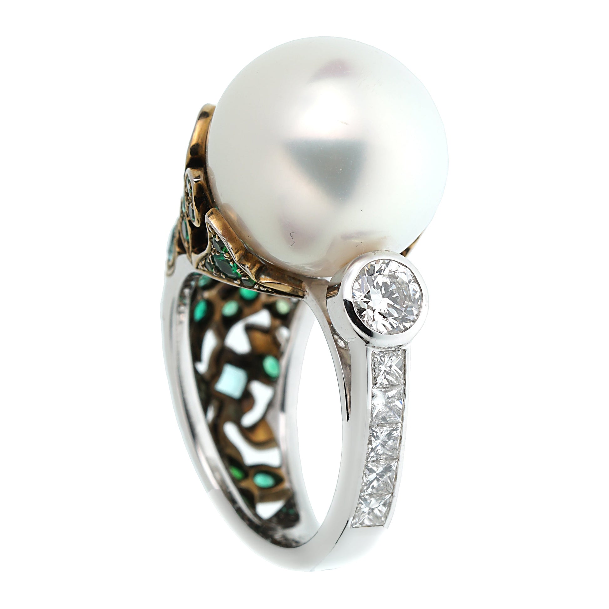 Circling the South Sea pearl is a harmonious blend of precious gemstones - lush emeralds tsavorites, and mesmerizing Paraiba tourmalines. The emeralds provide a lush green contrast that makes the pearl stand out even more. The tsavorites add a unique shade of green, creating a sense of depth and adding to the ring's mystique. The Paraiba tourmalines, one of the rarest and most valuable gemstones in the world, radiate an electric blue-green hue, contributing to the ring's breathtaking color palette.