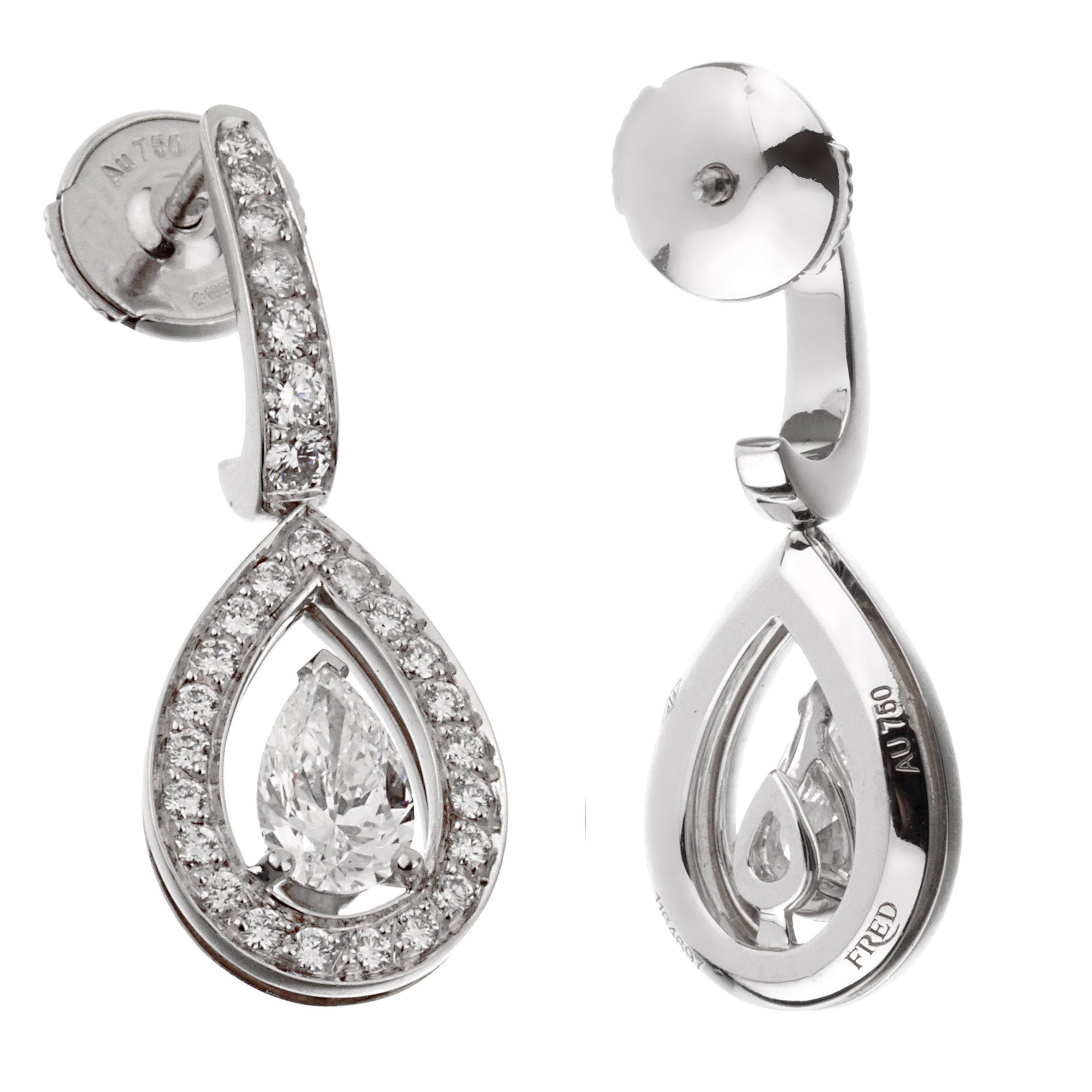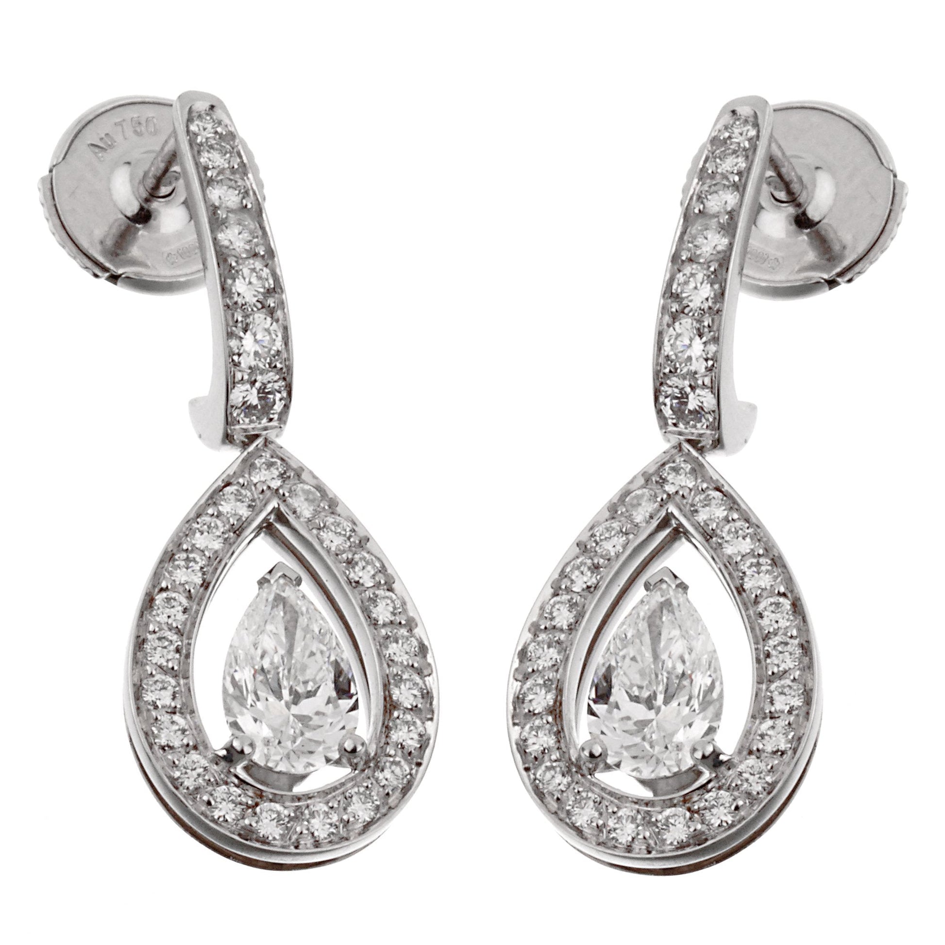 A stunning pair of Frthted of Paris diamond drop earrings, each earring showcases a .51, and .52ct central pear shaped diamond E color VVS2 adorned with round brilliant cut diamonds in shimmering 18k white gold. Each central pear shaped diamond is accompanied with a GIA certificate. The earrings have a total weight of 1.62ct