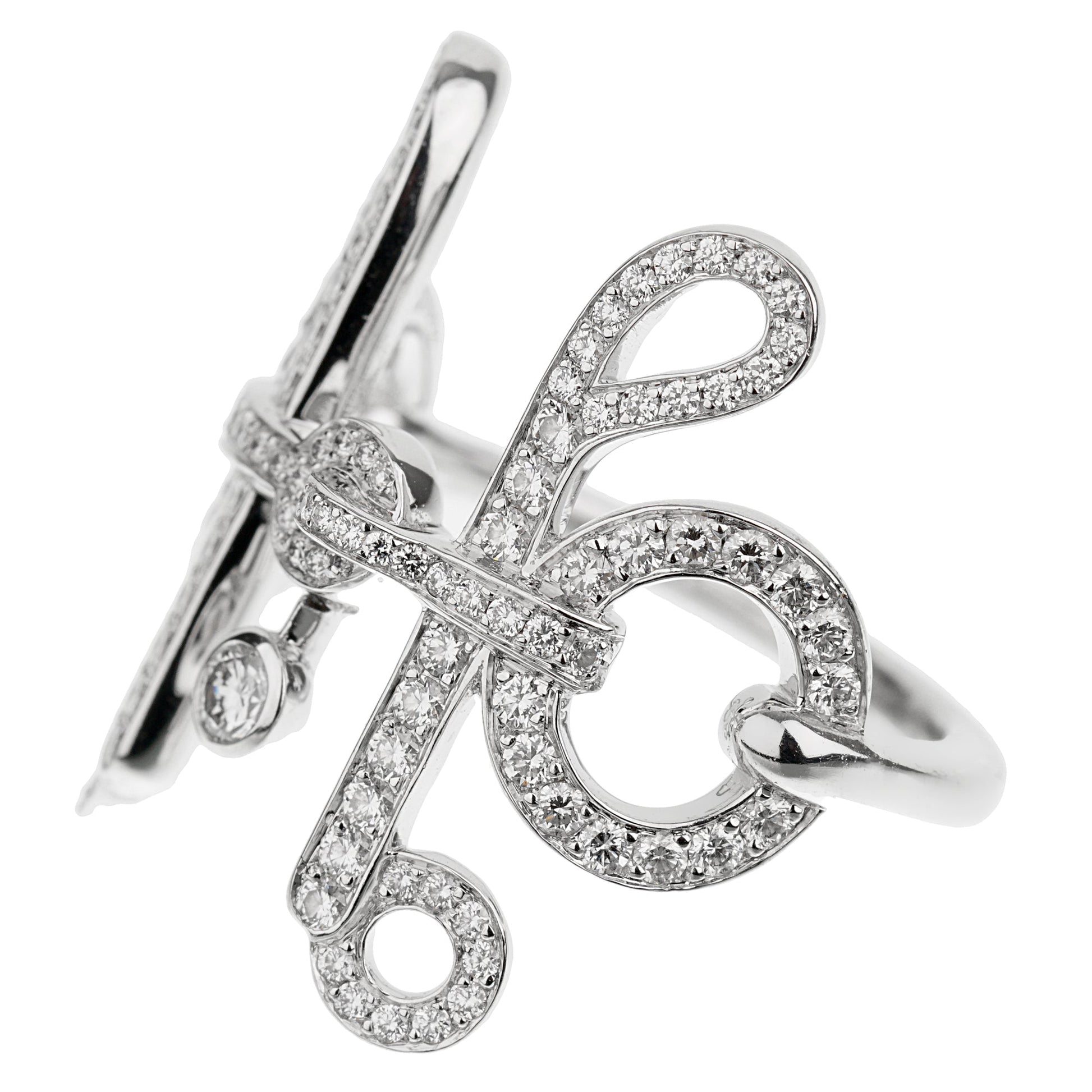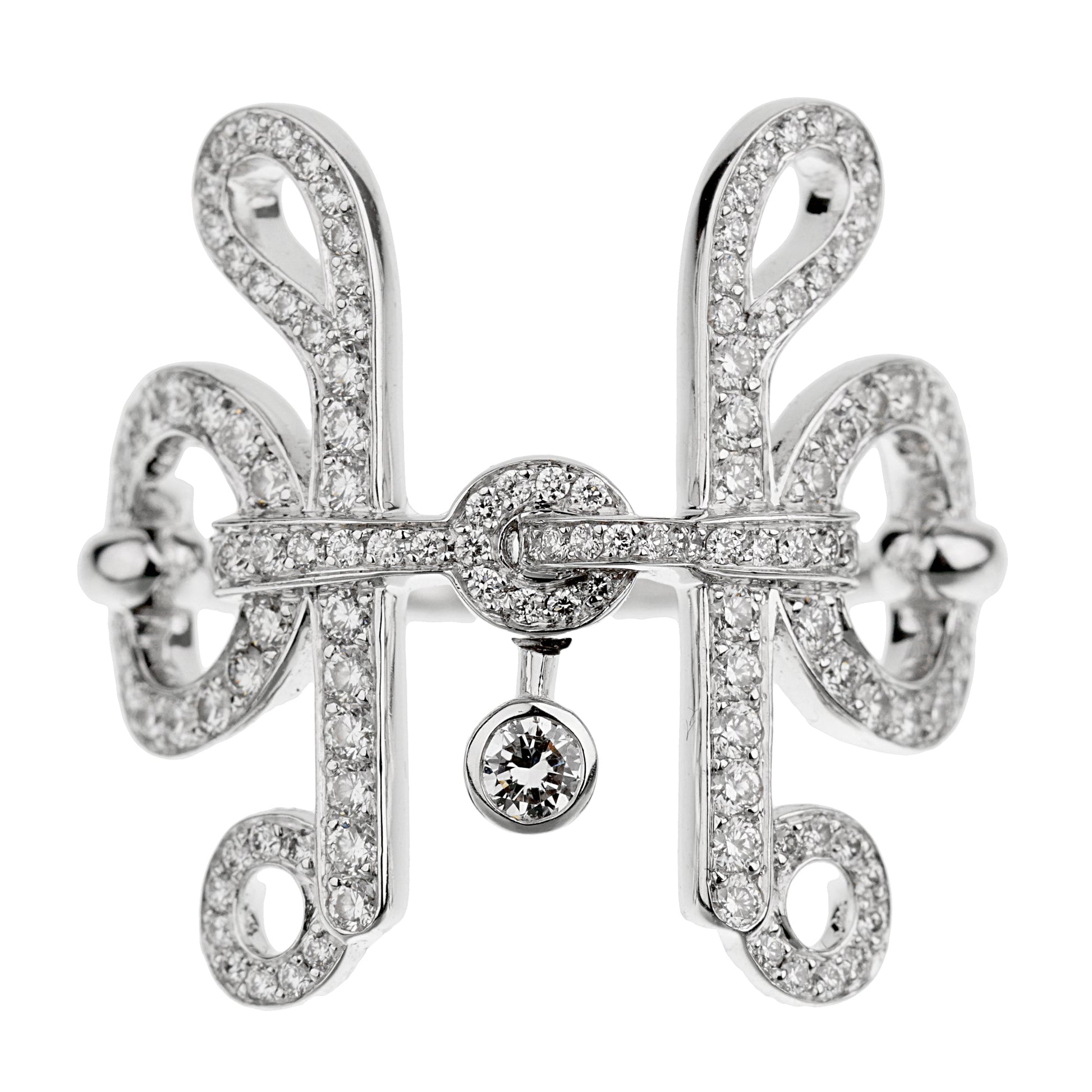 Meticulously crafted in luxurious 18-karat white gold, the ring features a delicate and intricate Filet D'or pattern, inspired by the iconic Herthtmes equestrian heritage. The lustrous white gold serves as a striking backdrop for the radiant diamonds, emphasizing their brilliance and sparkle.
