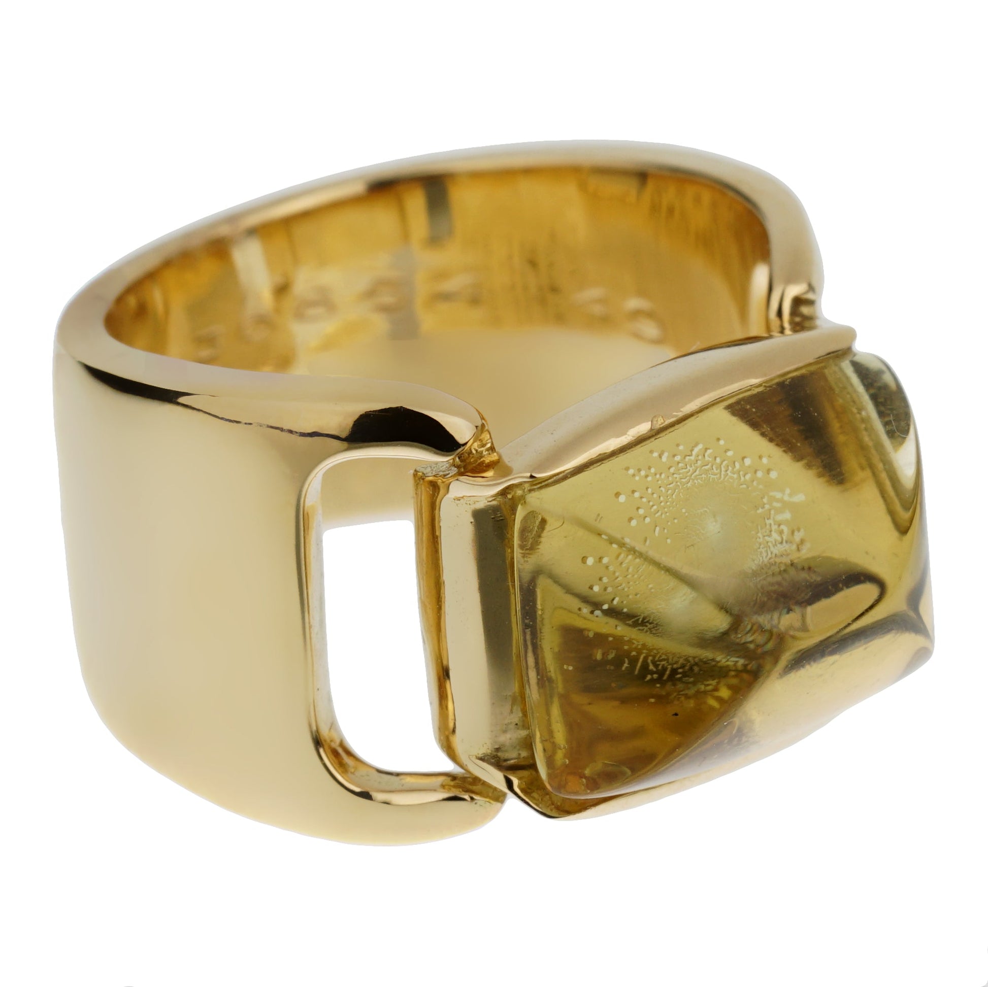 The centerpiece of this remarkable ring is the inverted cabochon lemon quartz, a bold and striking design choice that reflects the innovative spirit of Herthtmes. The lemon quartz, with its delicate hue and exceptional clarity, captures and reflects light in a mesmerizing manner, creating a captivating interplay between the gemstone and the yellow gold setting.