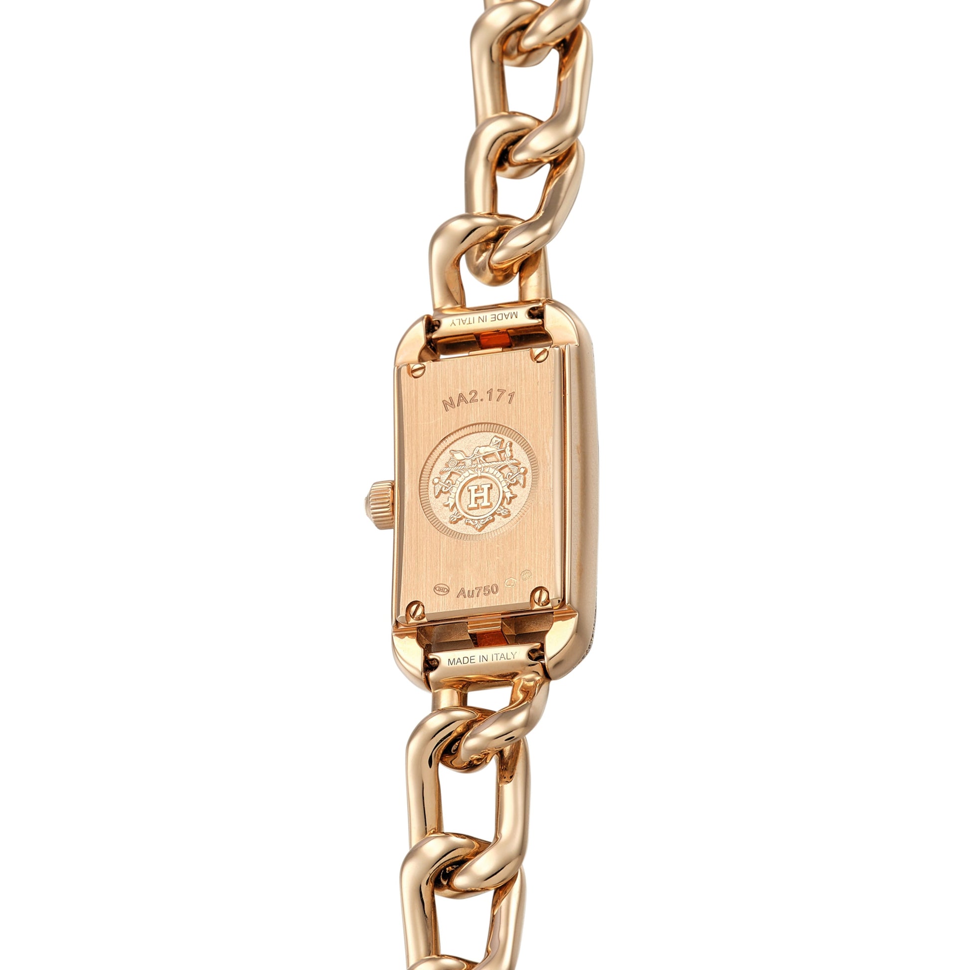 The watch features a rectangular case measuring 29 mm in height and 17 mm in width, offering a delicate yet prominent presence on the wrist. Crafted from 750/1000 rose gold, the case exudes warmth and sophistication. The bezel is adorned with 186 meticulously set diamonds, totaling approximately 0.58 carats, which enhance the watch's opulence without overwhelming its refined aesthetic.