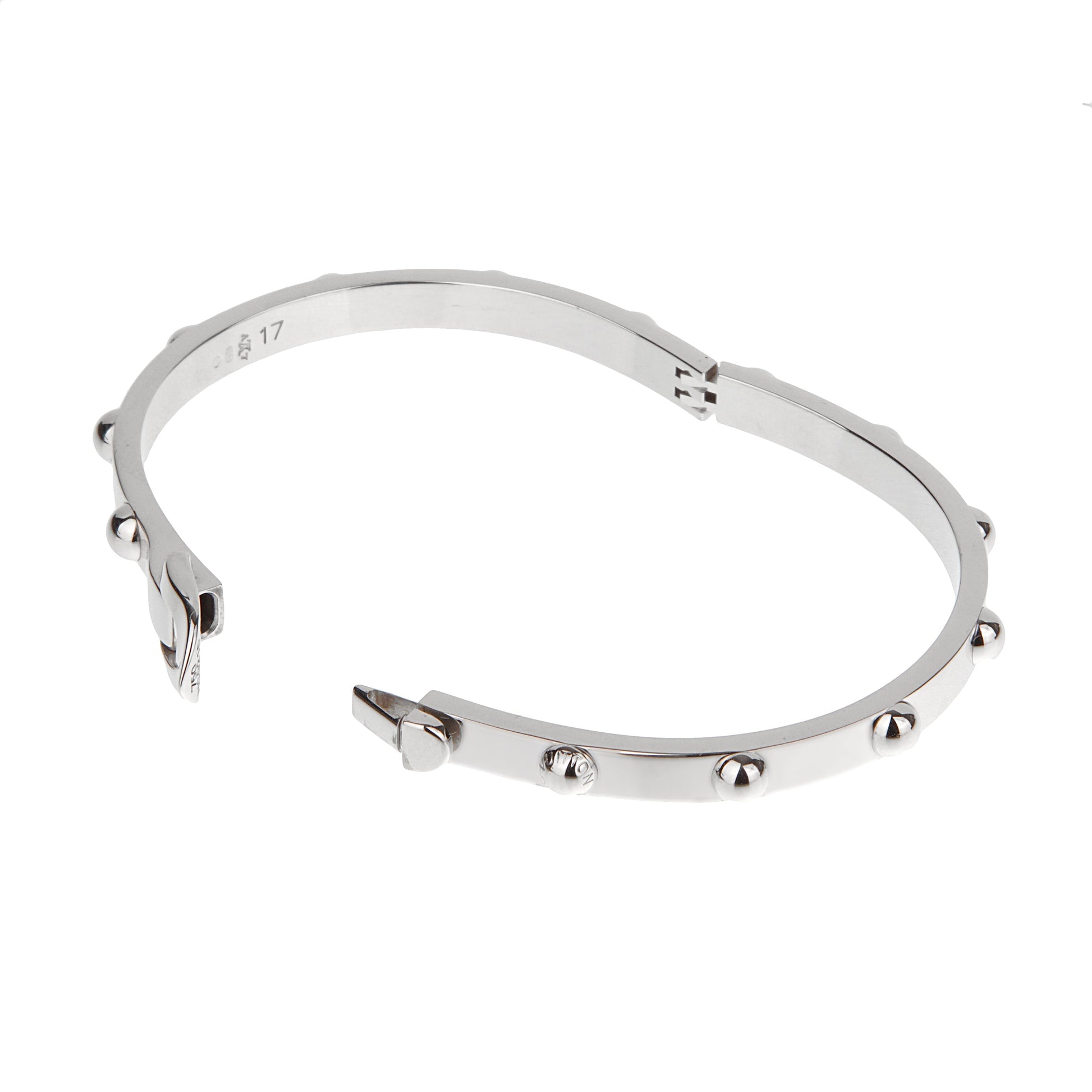 The bracelet's design is both sleek and modern, featuring a smooth, polished surface that reflects light beautifully. Its minimalist aesthetic is enhanced by the addition of evenly spaced studs that encircle the bangle. These rounded studs add a unique texture and visual interest to the piece, creating a subtle yet striking contrast against the glossy white gold.