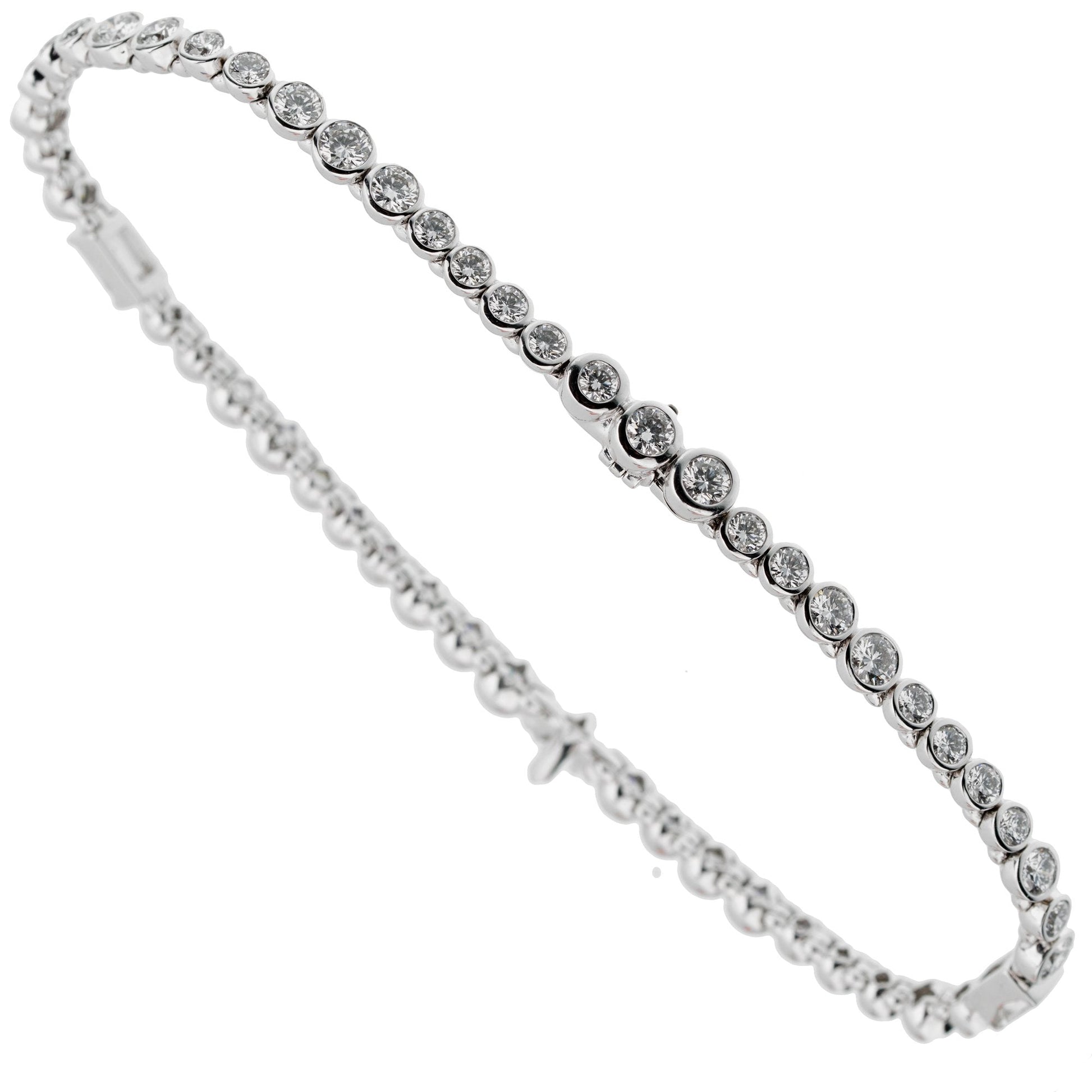 The piece features an array of perfectly matched, round brilliant cut diamonds that glitter with exceptional brilliance. Each diamond is meticulously set within a delicate bezel setting, emphasizing its radiant sparkle and creating a continuous circle of light around your wrist.?