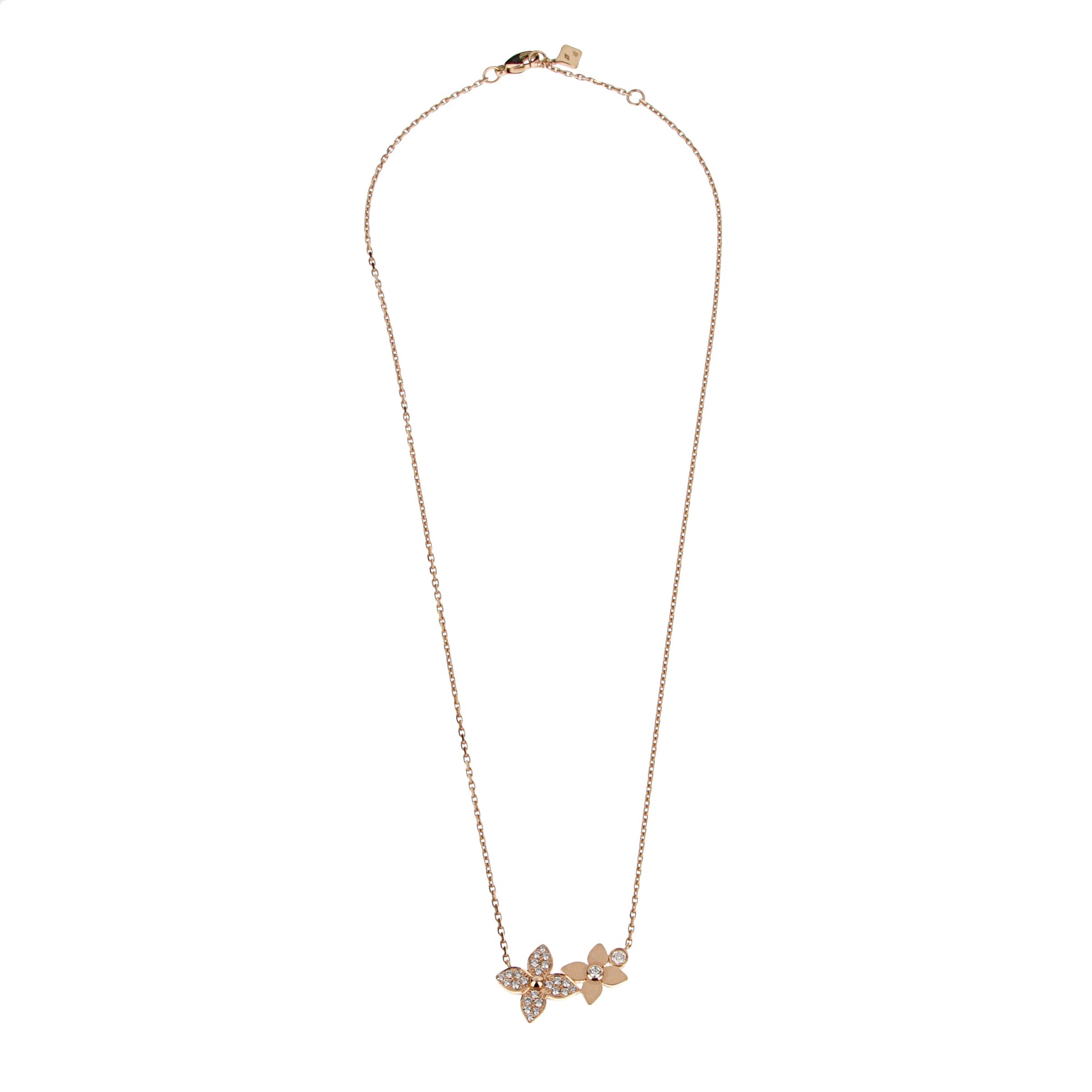 This delicate necklace is crafted from 18-karat pink gold, which exudes a warm, rosy glow that complements all skin tones. The necklace?¡¥s fine design is enhanced by two Monogram Flower motifs, each thoughtfully designed to showcase Lothtuis Vuithttton's legacy. The larger flower is meticulously pav¡§|-set with 26 brilliant-cut diamonds, totaling approximately 0.3 carats. These diamonds radiate dazzling brilliance, adding a touch of opulence and sparkle to the piece. The smaller flower, crafted entirely from polished pink gold, offers a stunning contrast, creating a harmonious balance between understated elegance and radiant glamour.