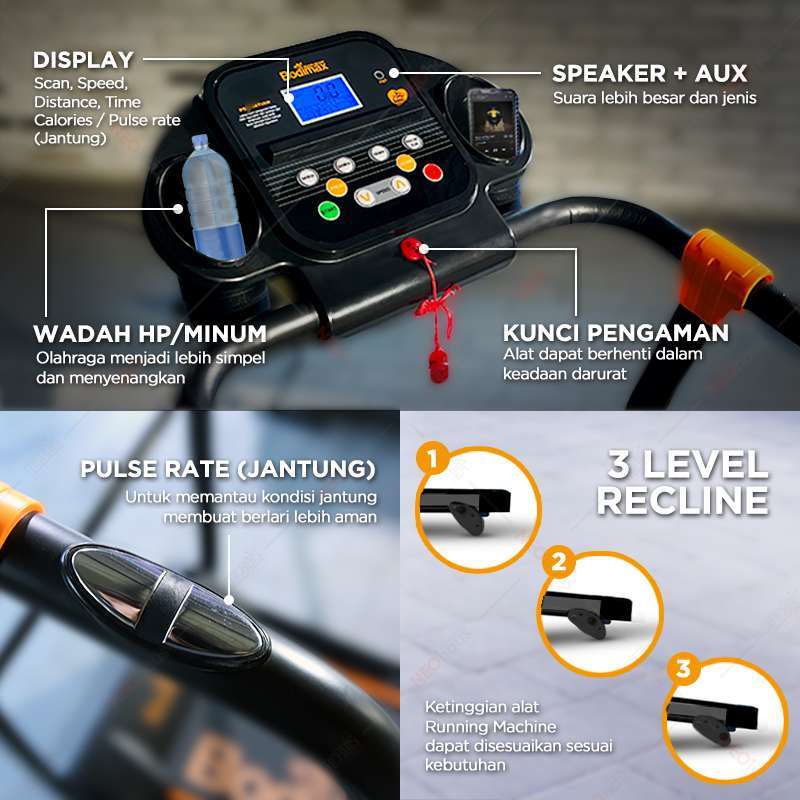 Panel Display: Treadmill Elektrik Bodimax Running Machine memiliki monitor dengan panel display untuk memantau kecepatan, jarak tempuh, waktu, kalori, dan dilengkapi dengan 12 program pre-set serta 1 program manual. Terdapat juga 5 pengaturan pintas kecepatan untuk fleksibilitas latihan.