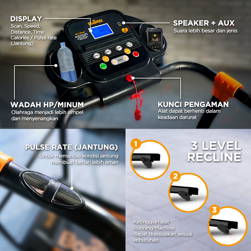 Treadmill Elektrik New Bodimax Running Machine alat olahraga praktis yang diciptakan oleh seorang spesialis alat kesehatan yang dapat digunakan sendiri di rumah anda dengan kecepatan 10km/h juga di lengkapi dengan panel kontrol yang mudah digunakan dengan tampilan SPEED, TIME, DISTANCE, CALORIES, dan PRE-SET programs