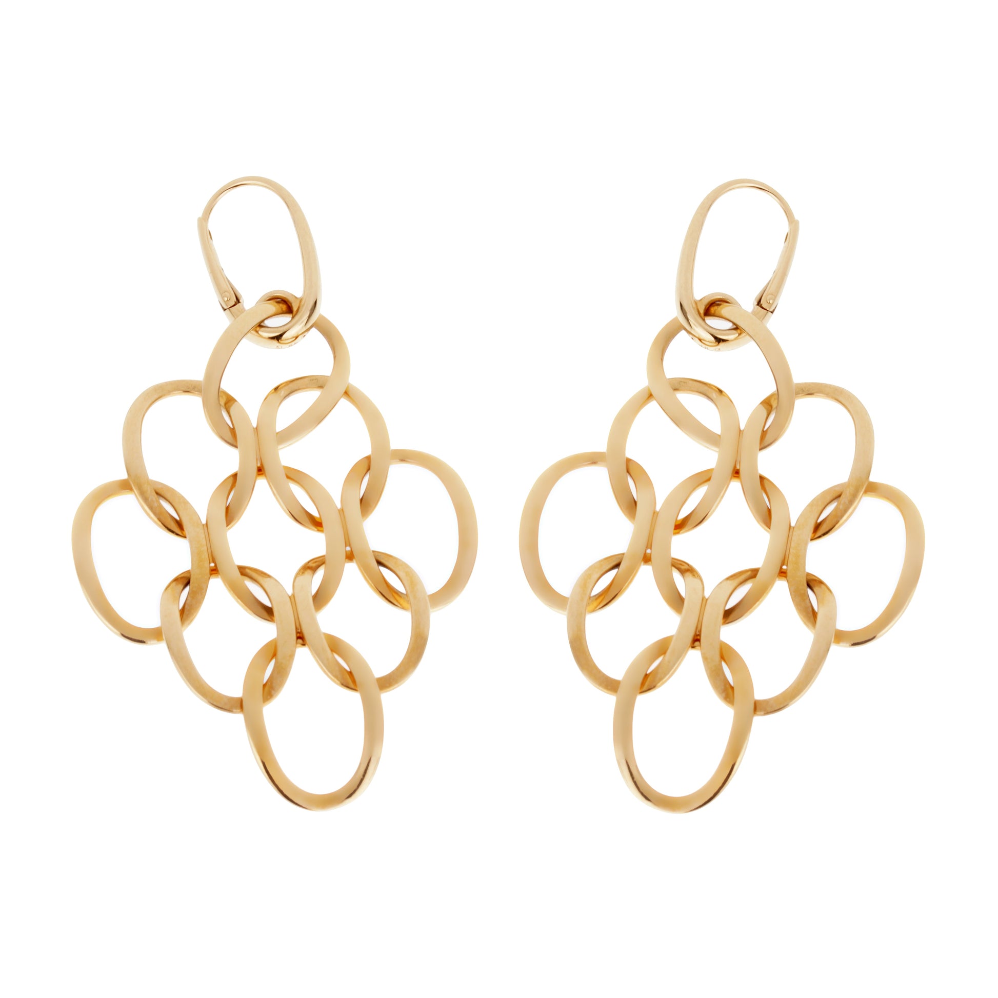 Each earring features a cascading arrangement of oval links, carefully interlocked to form a fluid and airy silhouette. The openwork design creates a lace-like effect with a contemporary twist, allowing light to pass through and casting subtle reflections with every turn of the head. The polished finish enhances the warm glow of the rose gold, adding a soft luster that flatters all skin tones and elevates both casual and formal looks.