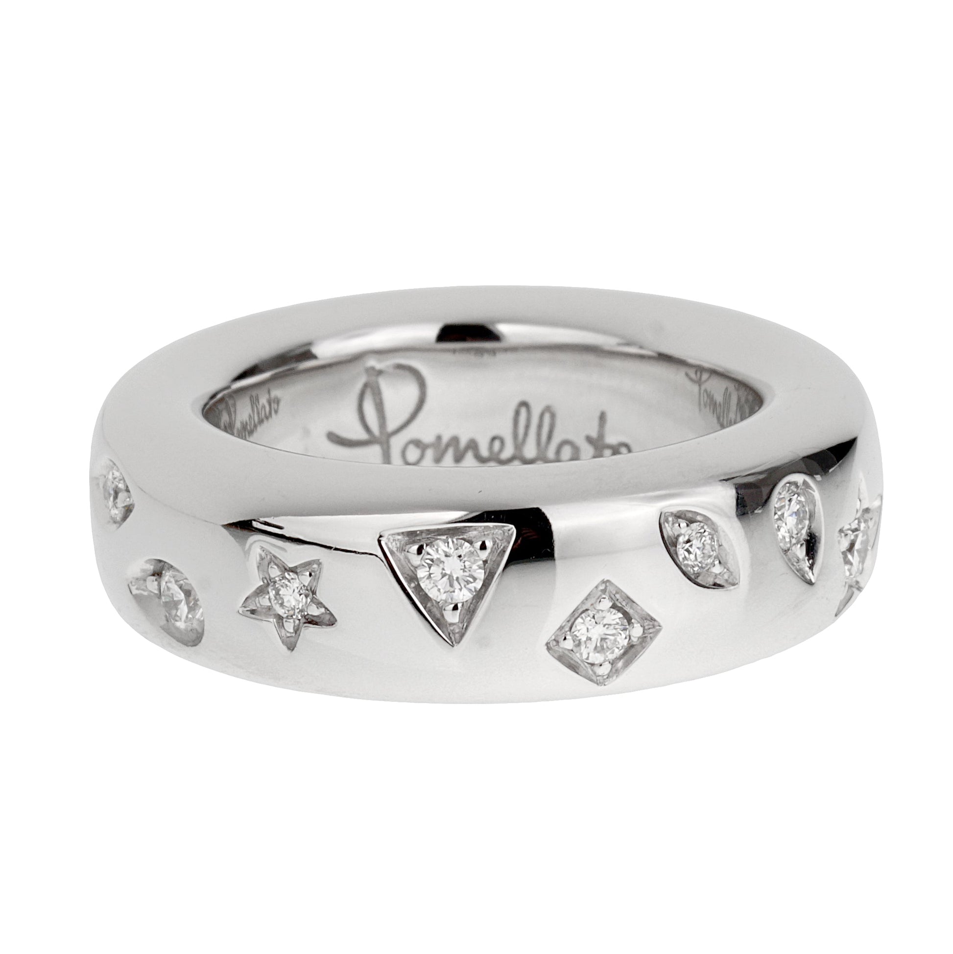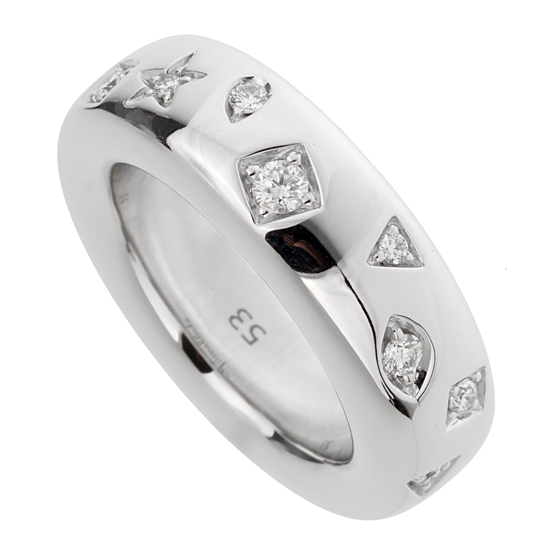 Adorning the ring's surface is an artful display of brilliant-cut diamonds, totaling approximately 0.50 carats. These sparkling diamonds are thoughtfully embedded in various whimsical geometric shapes, including stars, triangles, squares, and teardrops. Each diamond is meticulously set, highlighting Pothtmellato?¡¥s dedication to precision and craftsmanship. The playful arrangement provides a modern twist on traditional diamond rings, making this piece both distinctive and captivating.