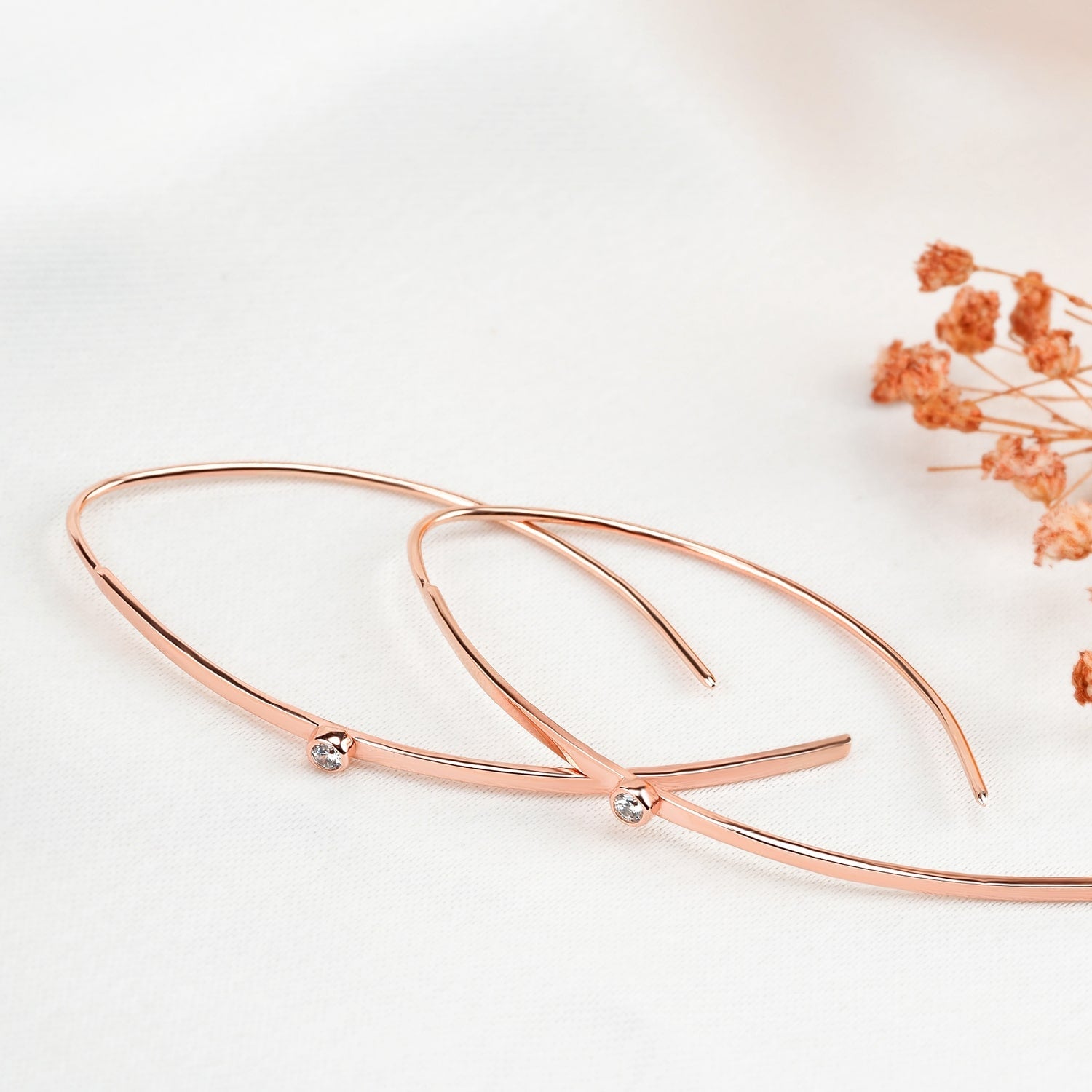Achieve a delicate and stylish look with our earrings adorned with sparkling zircon gems. The curved design adds a unique touch while the threader style allows for effortless wear.