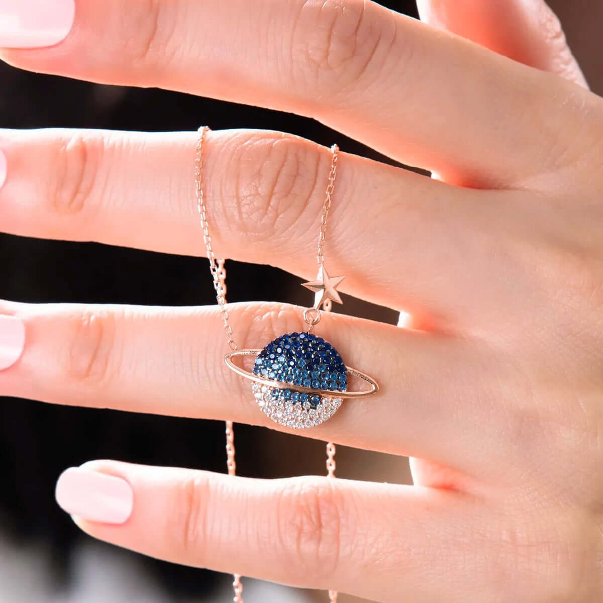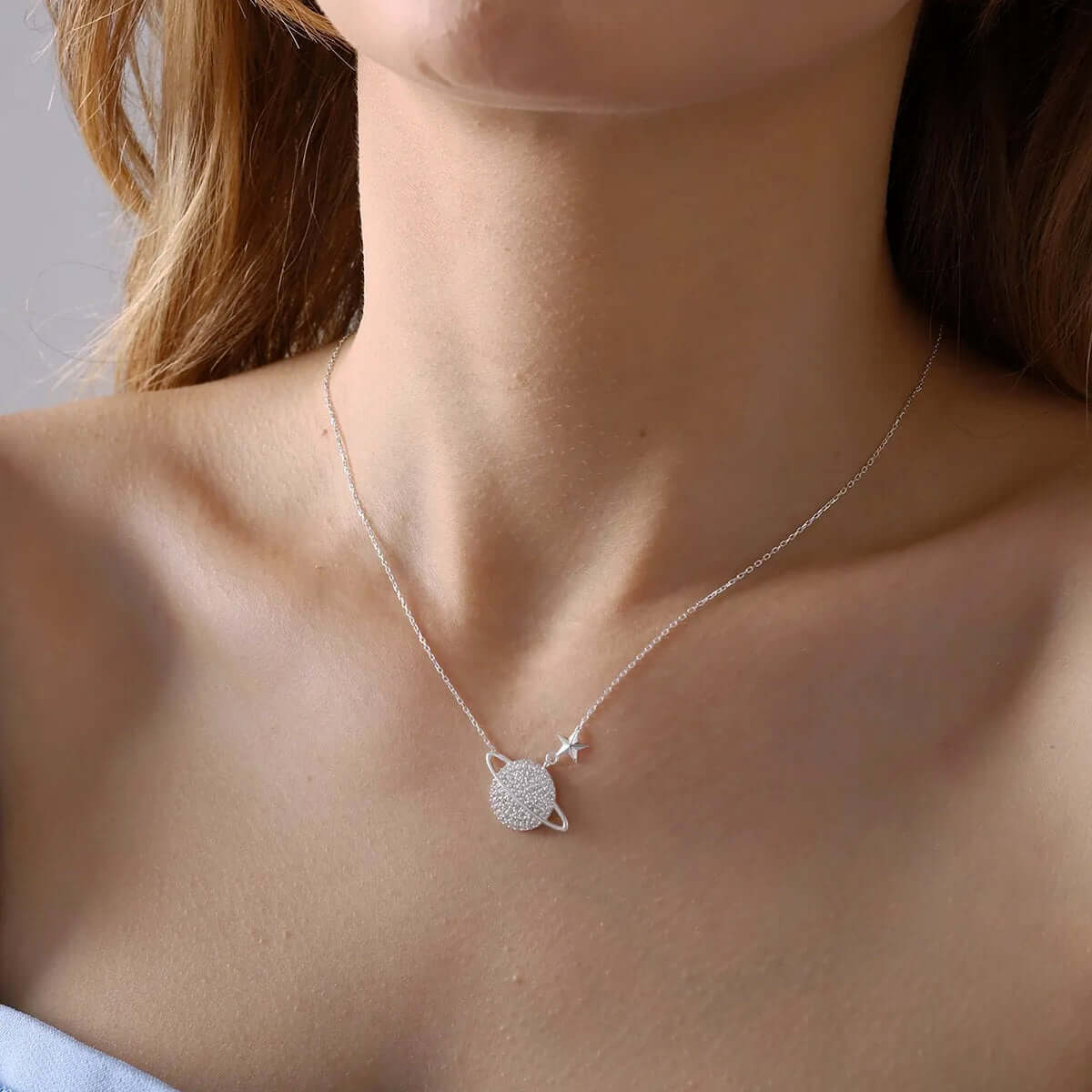 Saturn Planet Chain Necklace Black Cubic Zirconia in 925 Silver