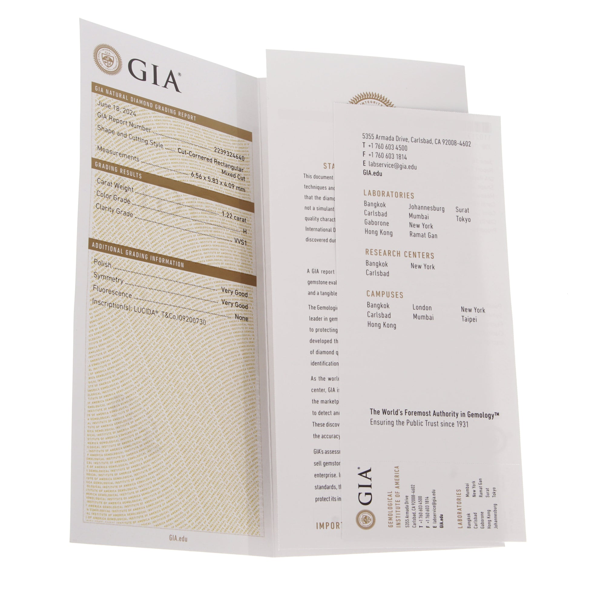 The center diamond, with a weight of 1.22 carats, is cut in tifthtfany's exclusive Lucida style, combining the elegance of an emerald cut with the brilliance of a round cut. This unique cut showcases the diamond's exceptional clarity and fire, creating a mesmerizing display of light and sparkle. The diamond is graded H in color, ensuring a near-colorless appearance that complements the platinum setting perfectly. Its VVS1 clarity grade indicates that the diamond is virtually free of inclusions, making it an exceptional and rare gemstone.