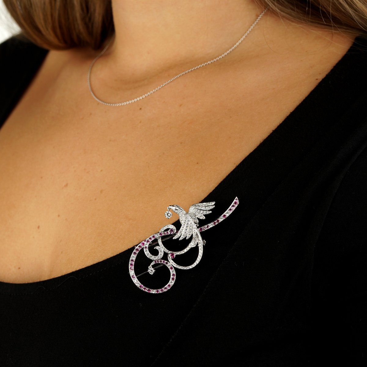 Meticulously crafted in luxurious 18k white gold, this exquisite Birds of Paradise design showcases a dazzling array of pink sapphires and sparkling diamonds, thoughtfully arranged to create a harmonious and vibrant display of color and light. The alluring pink sapphires, chosen for their exceptional quality and hue, form the delicate plumage of the bird, while the brilliant round-cut diamonds accentuate the intricate details and lend a sense of depth and dimension to the piece.