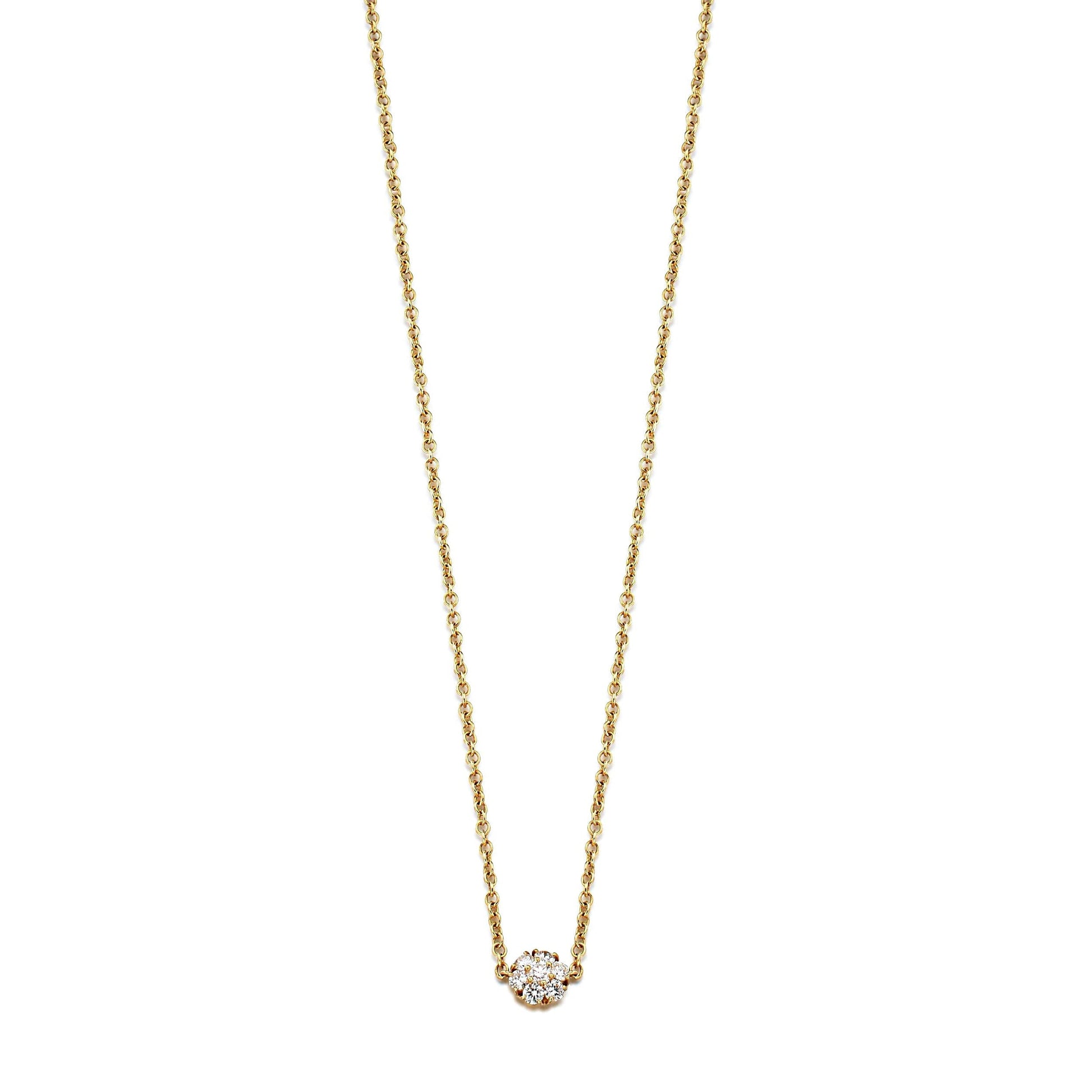 Expertly crafted in luxurious 18k yellow gold, this pendant necklace features a captivating floral motif at its heart. The design centers around seven meticulously selected round brilliant-cut diamonds, with a total weight of .73 carats. These diamonds are arranged in a harmonious floral pattern, each one representing a petal, to capture the essence of a blooming fleurette. The central diamond is slightly larger, drawing the eye and symbolizing the heart of the flower, while the surrounding diamonds add to the pendant's radiant sparkle.