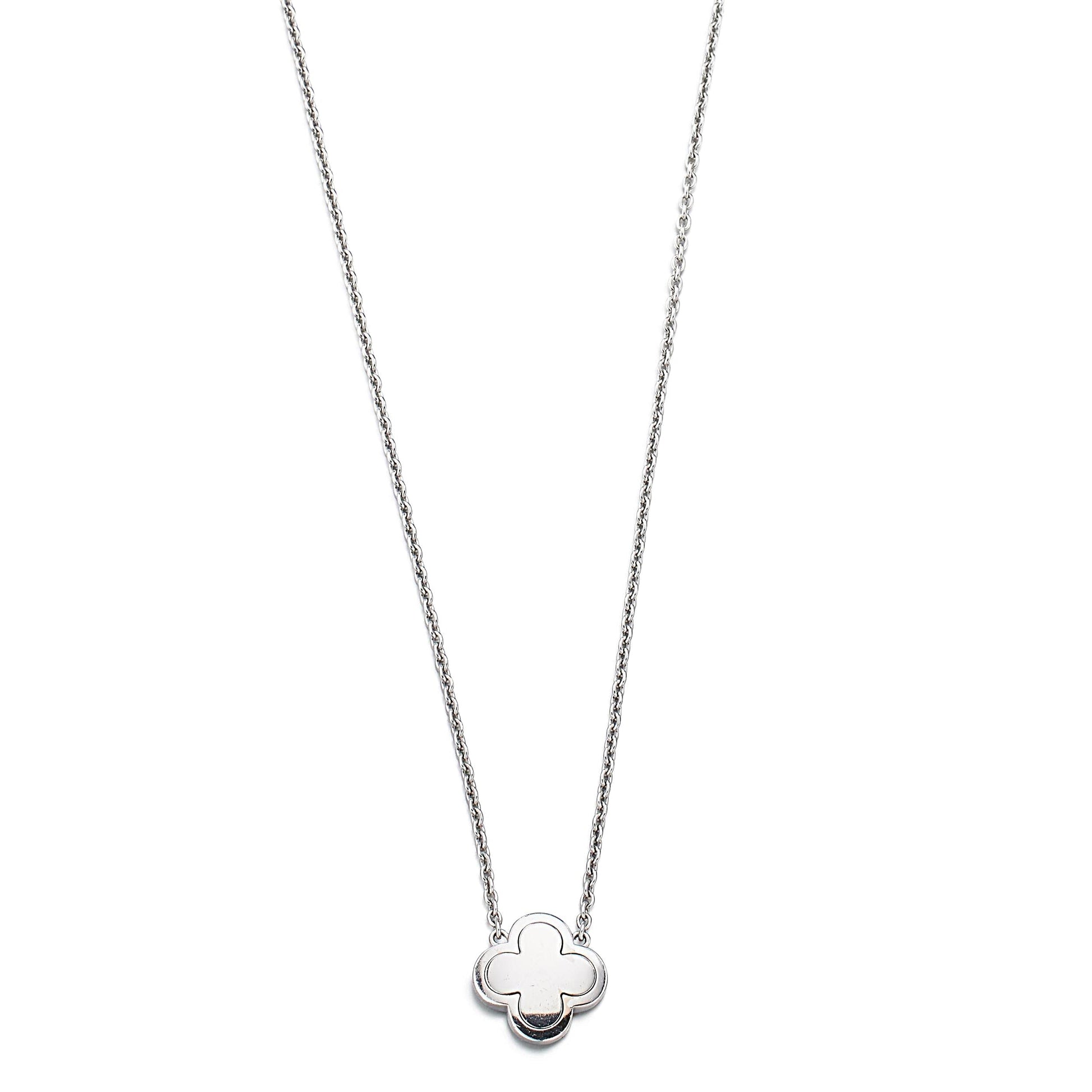 The Pure Alhambra motif is celebrated for its elegant simplicity and is perfectly complemented by the luminous white gold chain that it hangs from. The chain is designed to be both durable and delicate, making it an ideal piece for both everyday wear and special occasions.