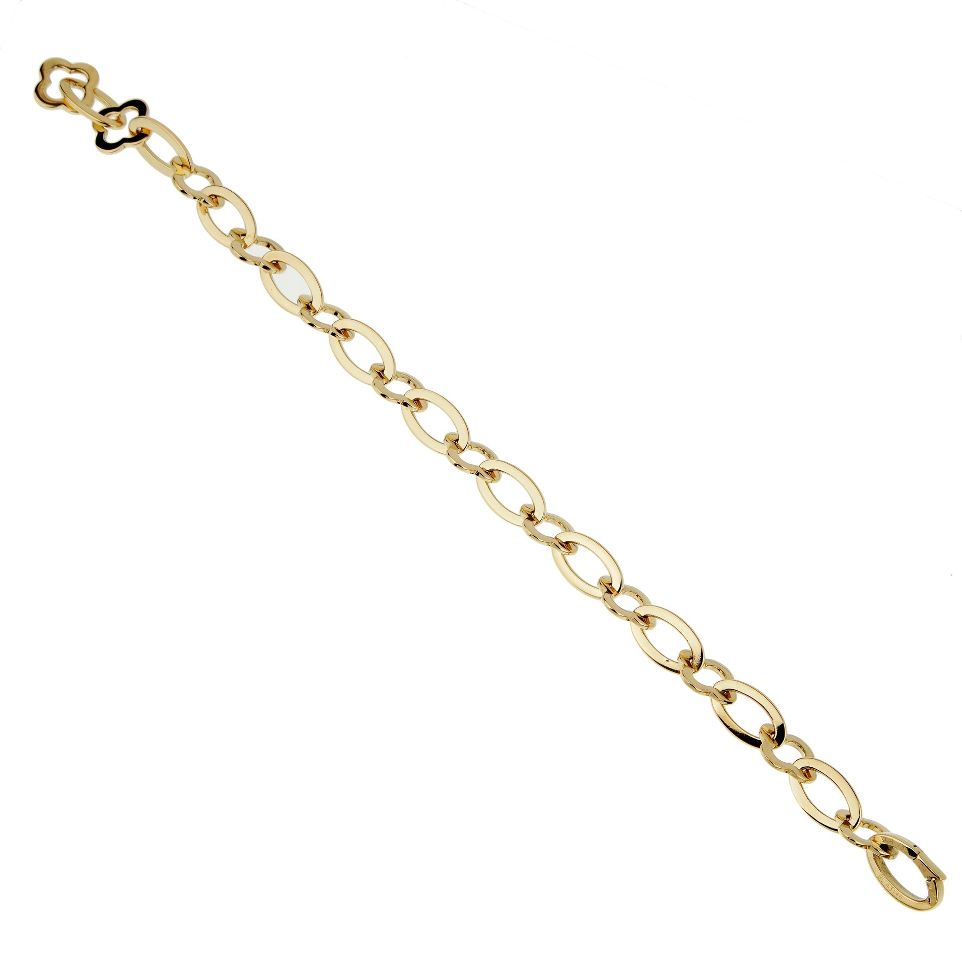 This exquisite bracelet features a series of four-leaf clover motifs, delicately crafted from 18k yellow gold. Each motif showcases the brand's exceptional attention to detail, with precise beveled edges and a gentle curve that captures the essence of the Alhambra's Moorish architecture. The clover motifs are elegantly connected by gold links, forming a fluid and comfortable bracelet that gracefully drapes around the wrist.