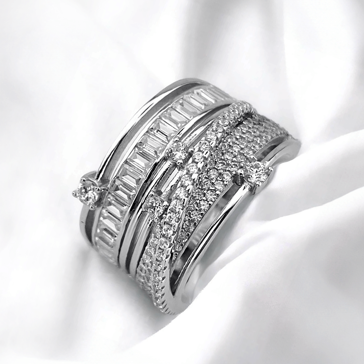 Embrace a whirlwind of style with our spiral ring. The white zircon gem accents add a touch of brilliance to this sterling silver ring. Perfect for making a statement at any cocktail party!??